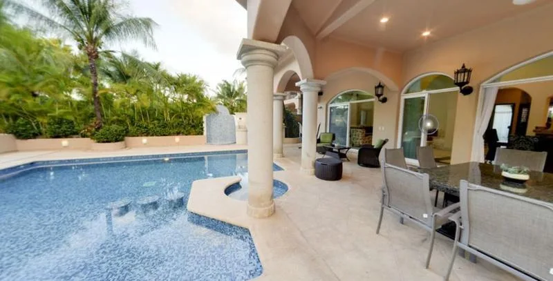 A large covered terrace at the rear overlooks the swimming pool and includes a barbecue area and an outdoor shower. The garden is landscaped with trees and tall palm trees.