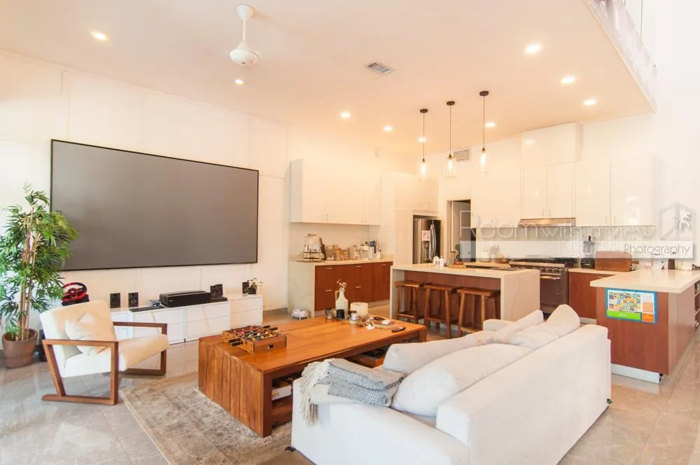 This two-story home features four bedrooms and three bathrooms. It has an open-concept layout with cathedral ceilings. The living and dining areas connect to a screened-in patio that opens to a private backyard with a pool and an outdoor grill area.