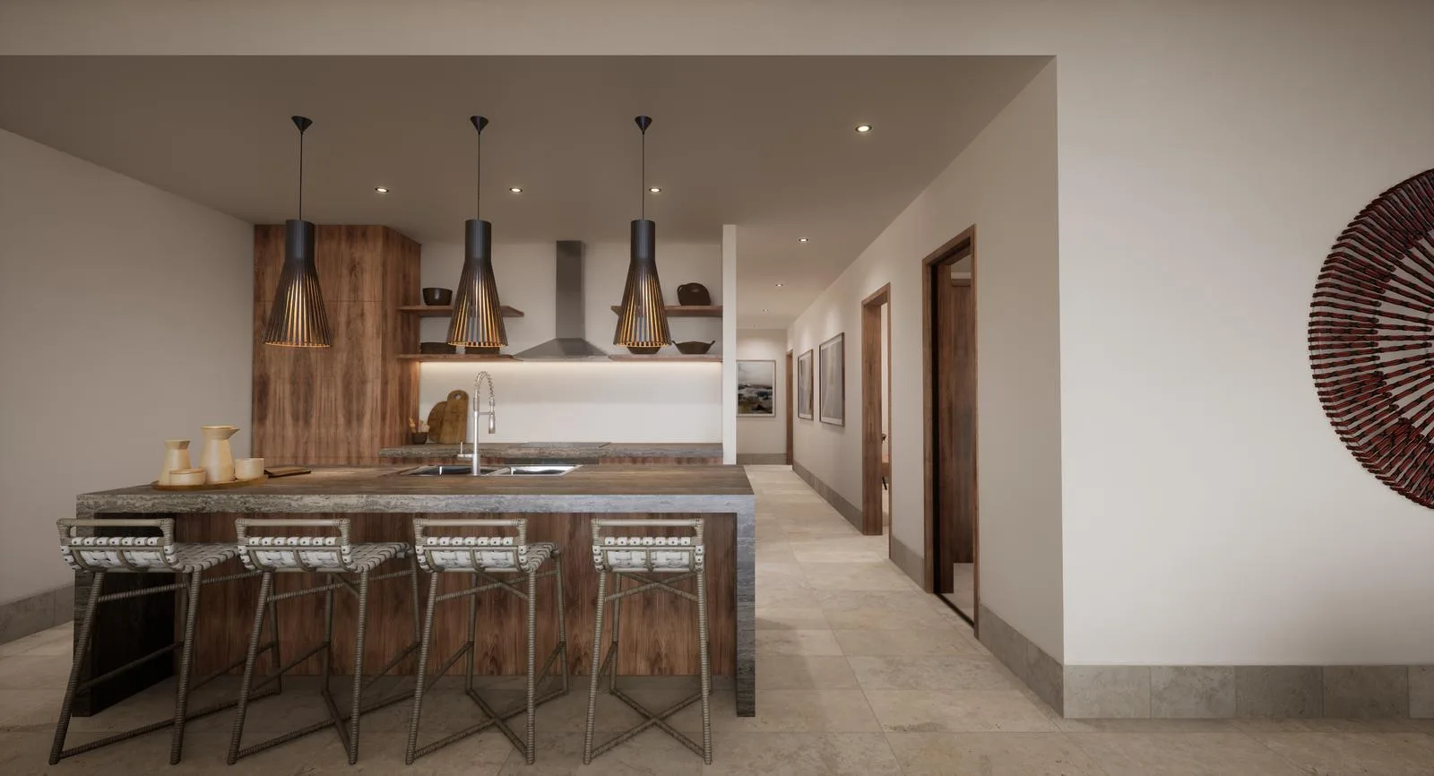 The residence features three spacious bedrooms, each with an en-suite bathroom. An open-concept living area includes a family room or TV lounge. The kitchen is fully integrated with a contemporary design and premium finishes. Large windows and balconies provide panoramic views of the Caribbean Sea. The private rooftop is suitable for a lounge area, grill, or jacuzzi. The unit includes an internal laundry area and a storage room.