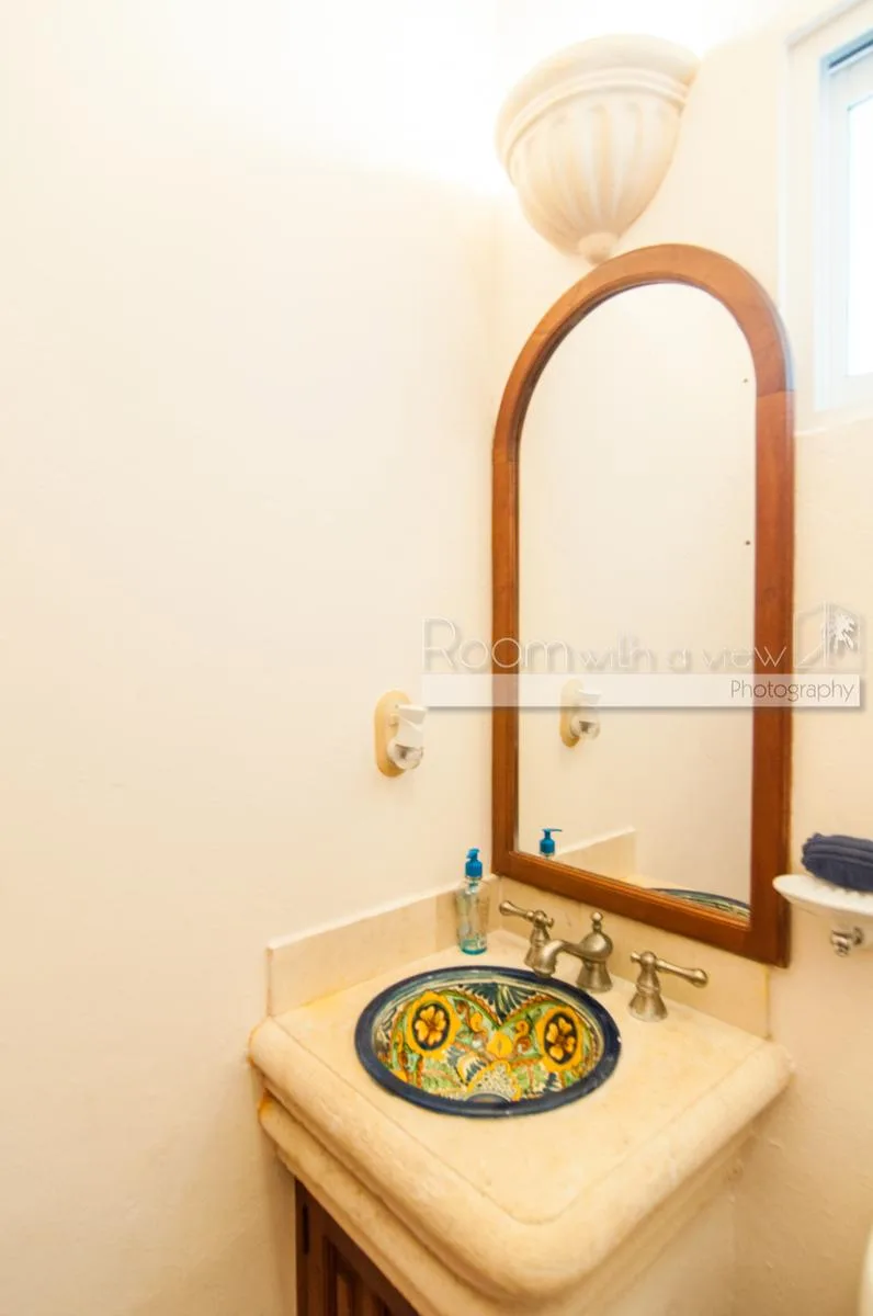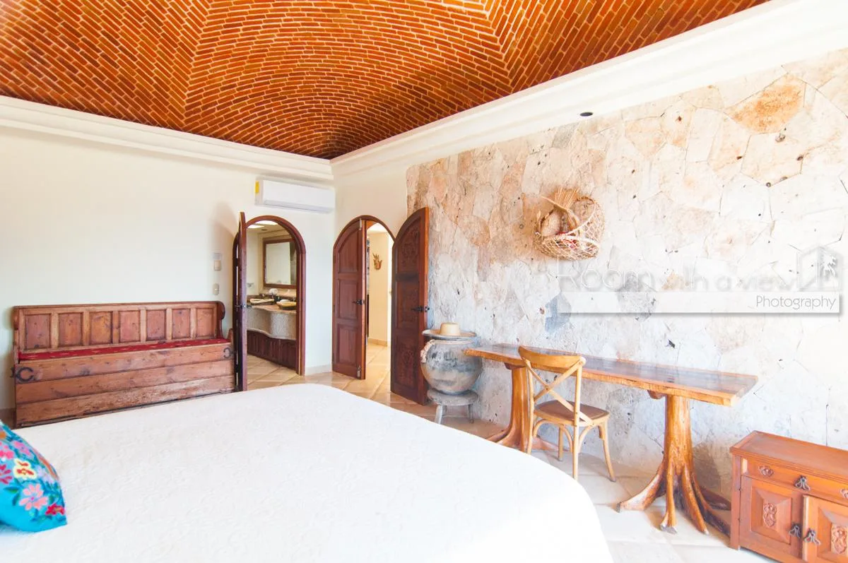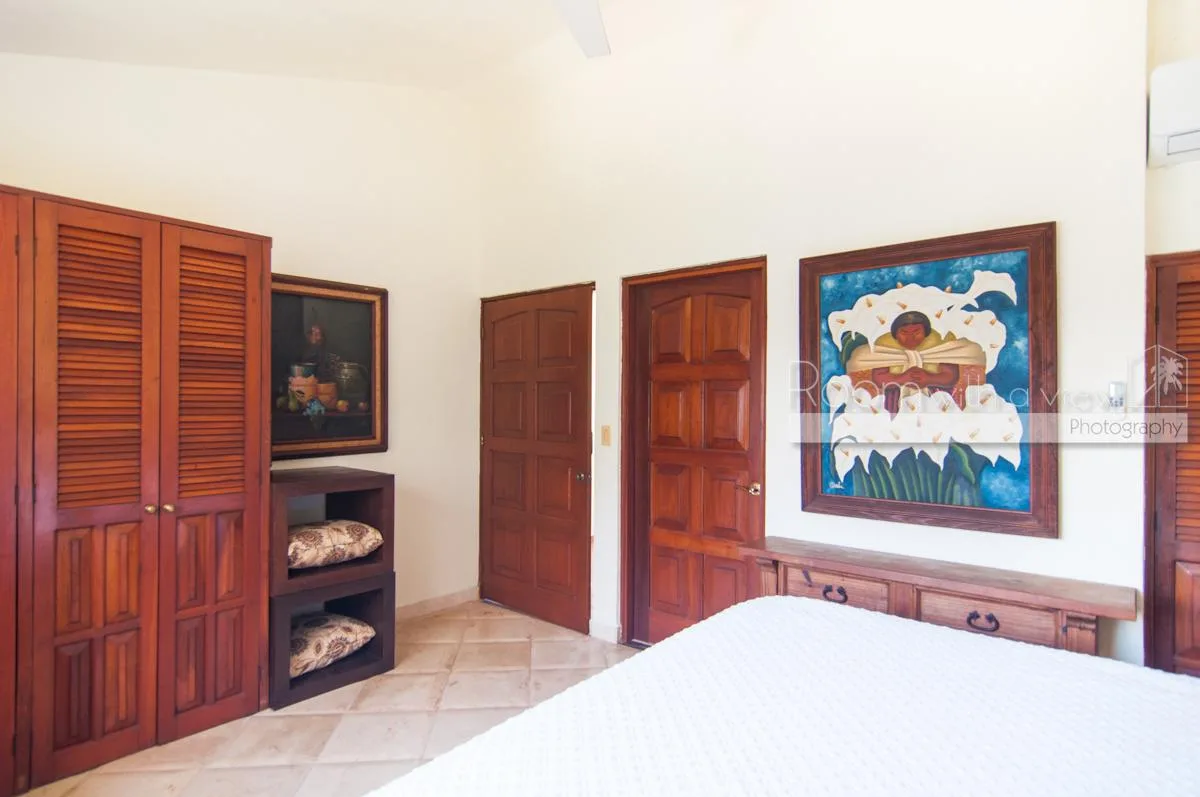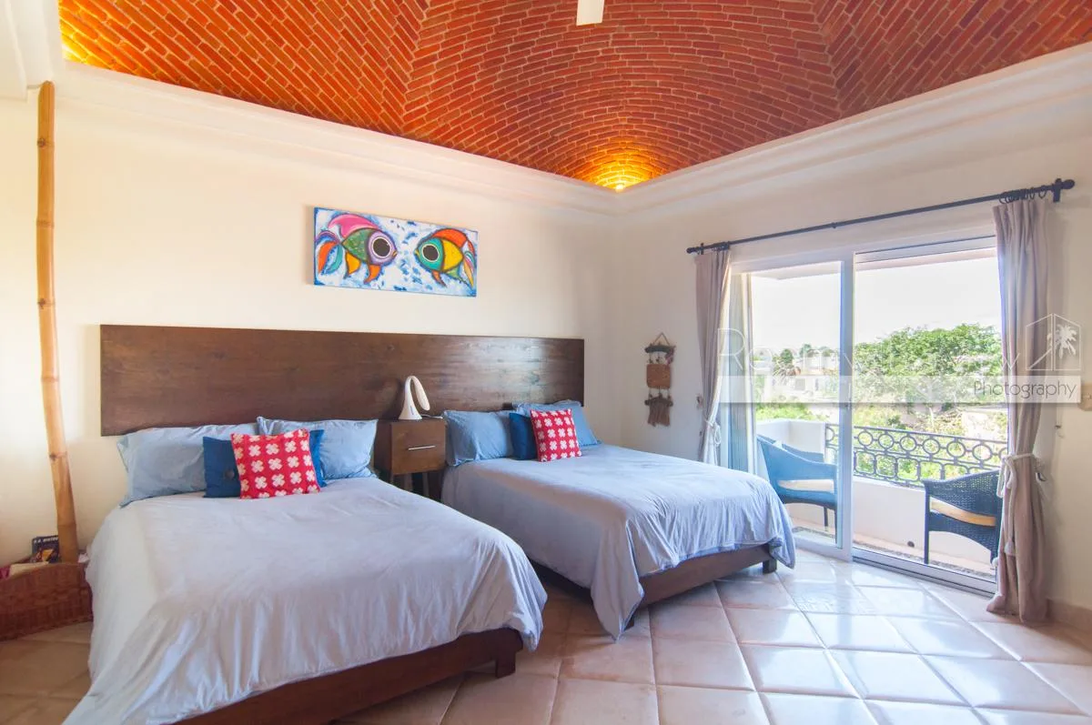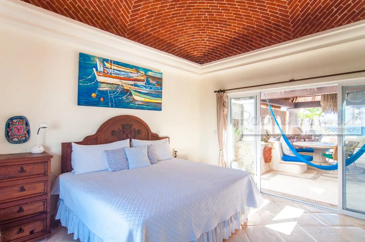 This oceanfront condo is situated on the top floor within a gated resort community in Puerto Aventuras. The residence features cathedral ceilings, skylights, and arched doorways. Intricately carved wood doors and high-end finishes are found throughout.