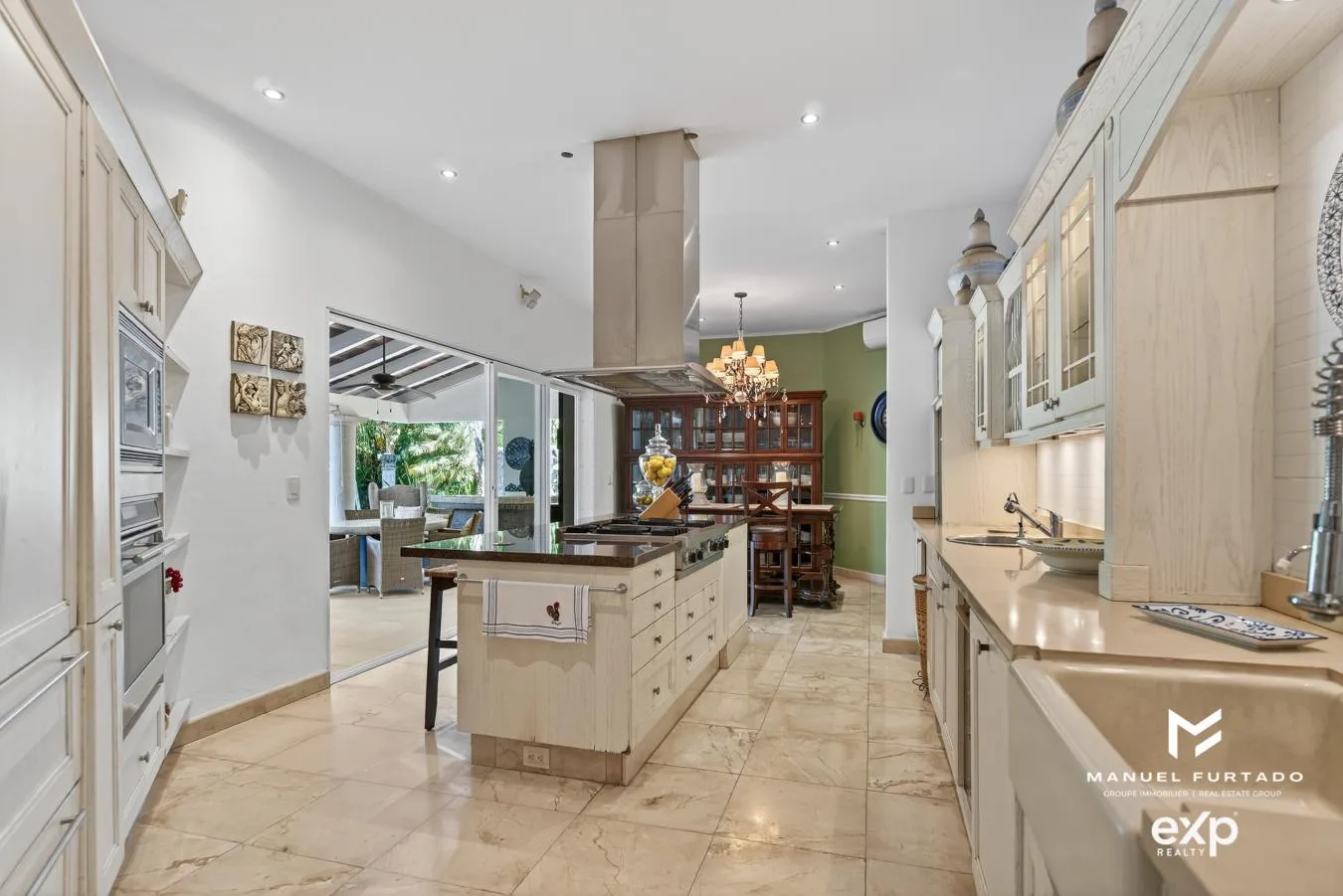 Villa Santiago is a three-bedroom villa situated along the Puerto Aventuras Golf Course within the gated community of Puerto Aventuras in the Riviera Maya. The residence features handcrafted wood finishes, marble floors, a grand library, and a gourmet kitchen.