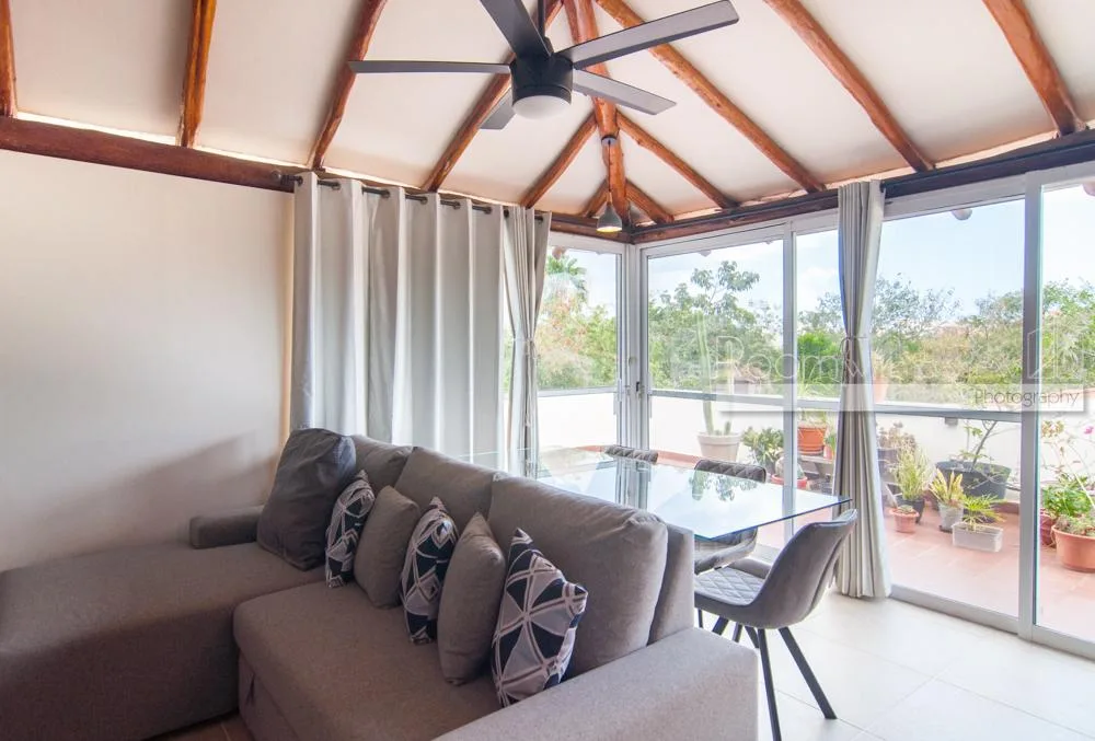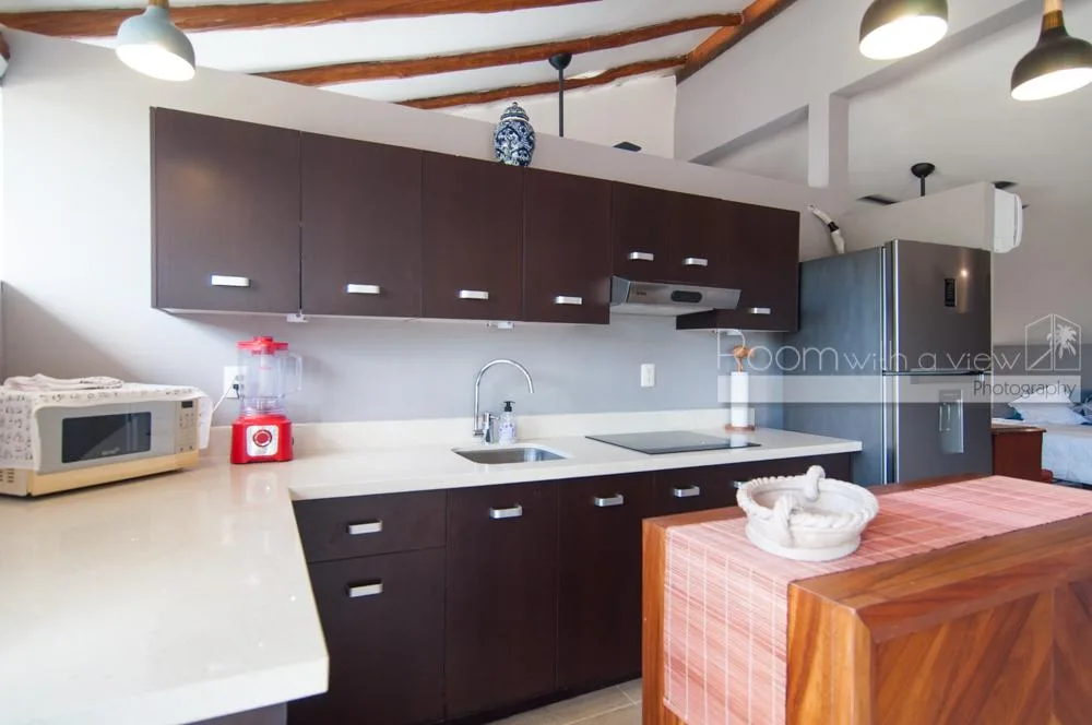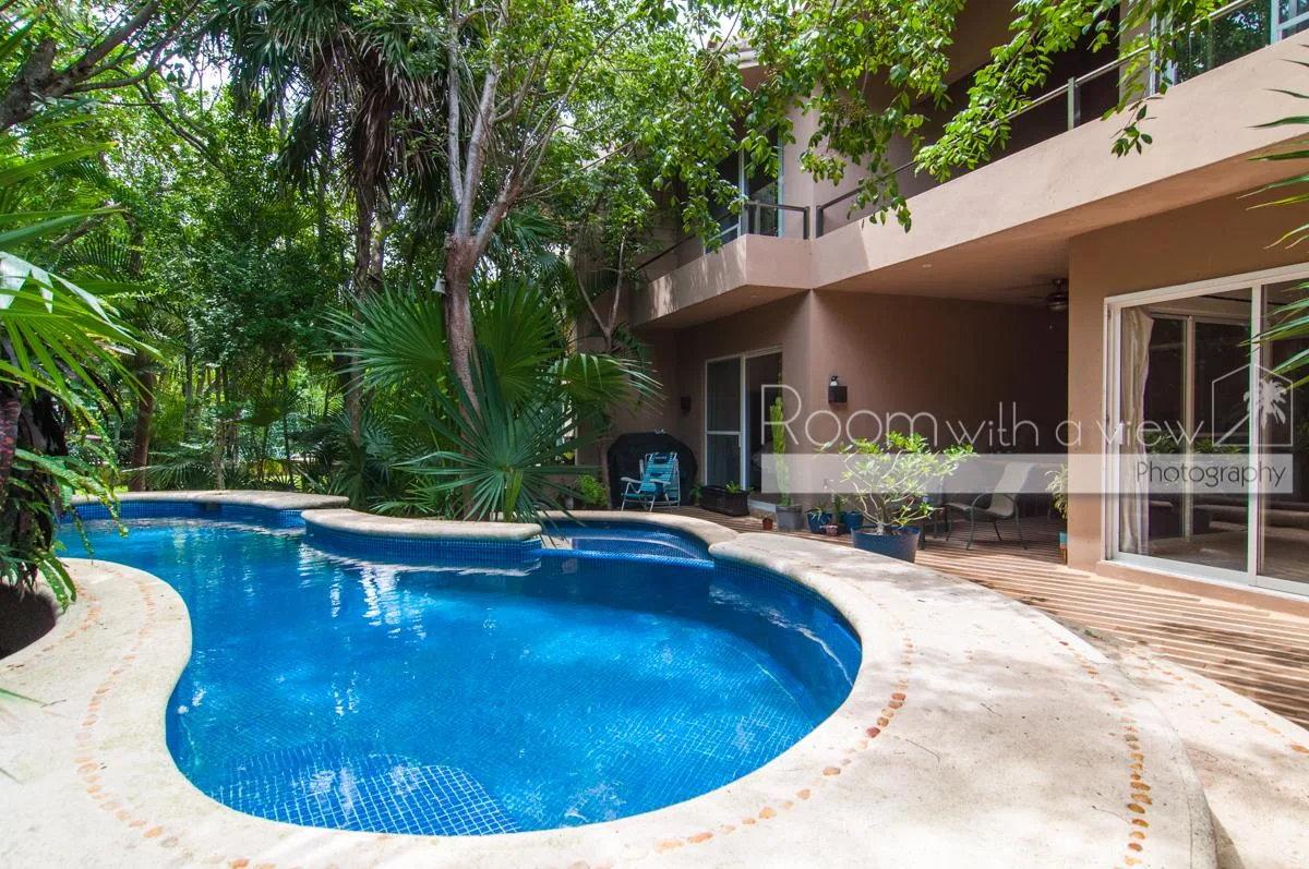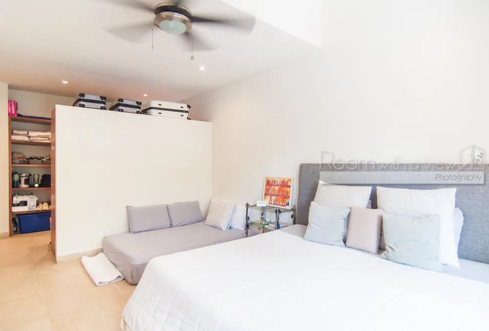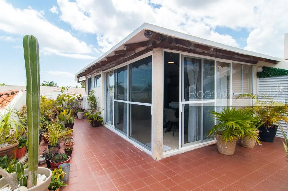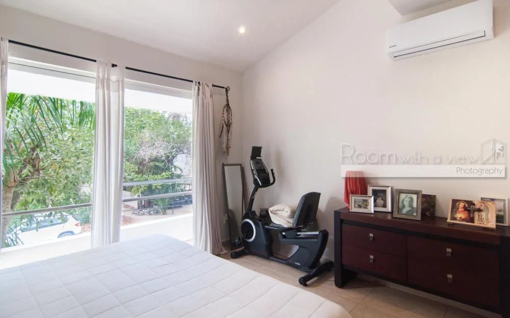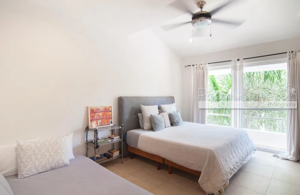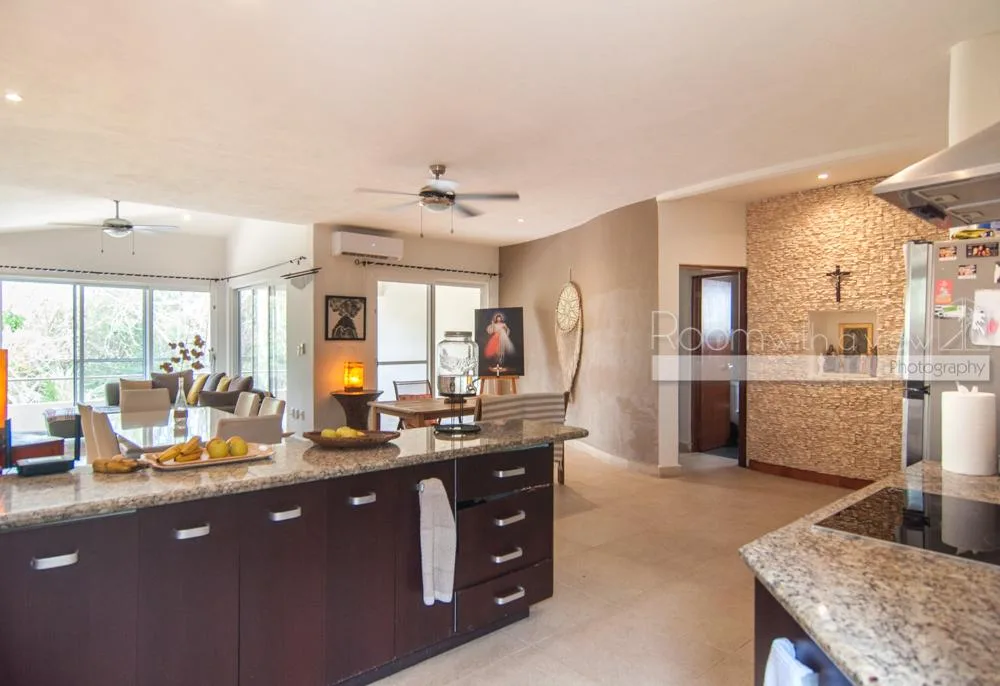 The home is a 3-minute walk from the marina and restaurants in Puerto Aventuras. It is 300 meters from the beach and 120 meters from the tennis courts. The property is divided into three self-contained units, one on each floor. The lower two floors each contain two bedrooms and two bathrooms. The top floor is a large studio penthouse with a private rooftop. Each floor features a full kitchen with an island, a walk-in closet, and a private balcony or terrace.