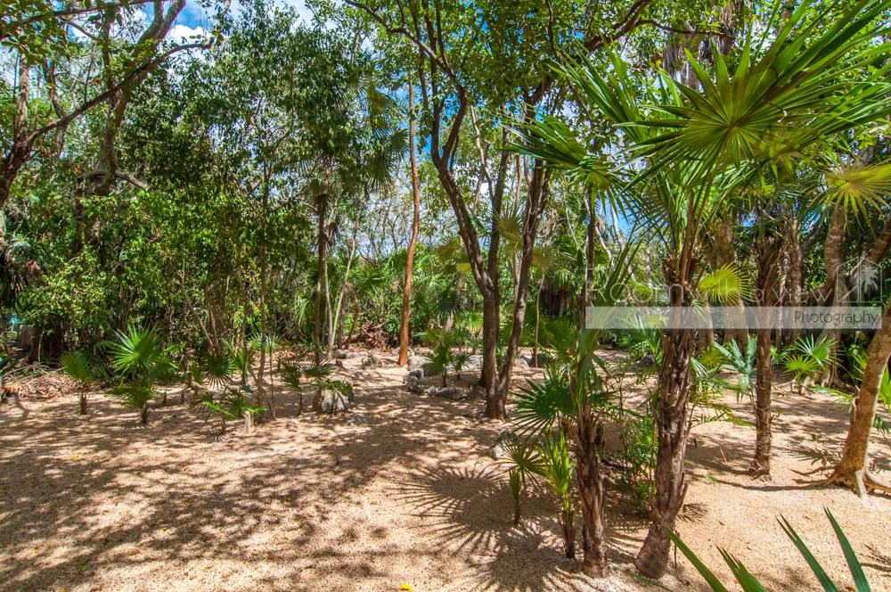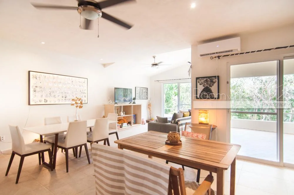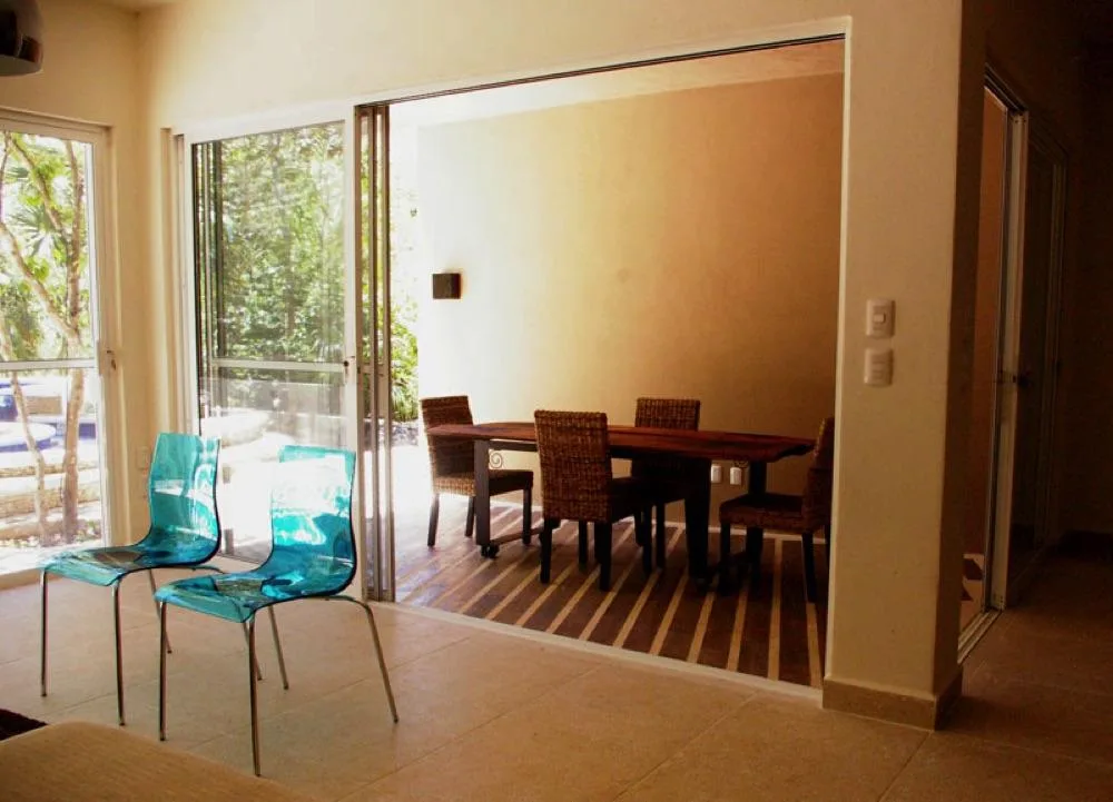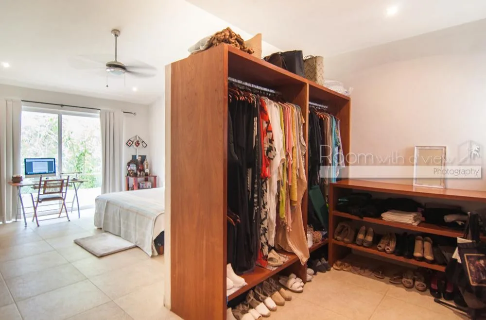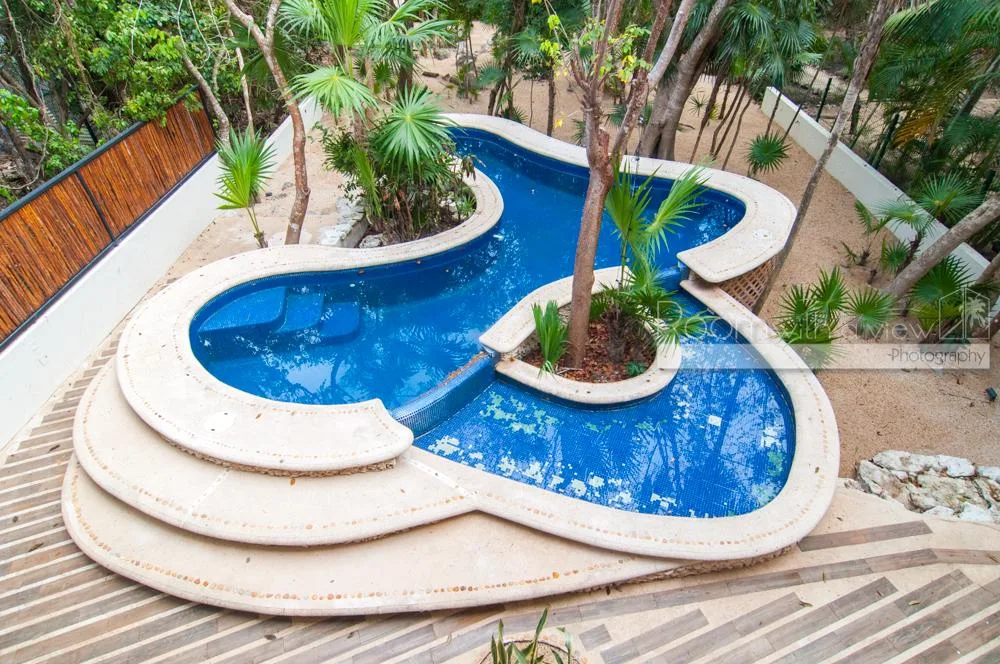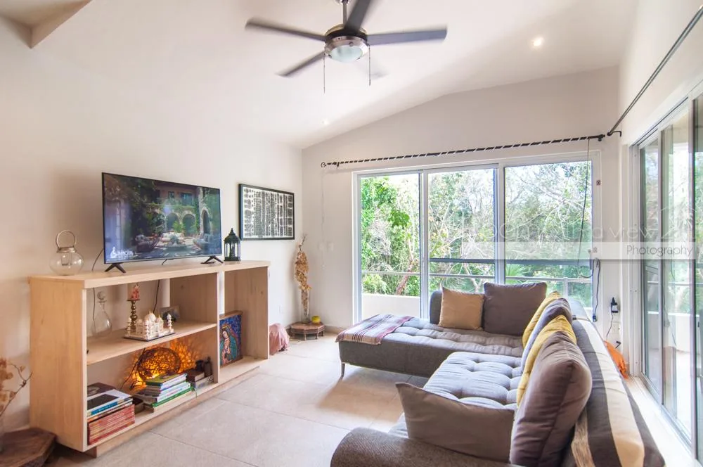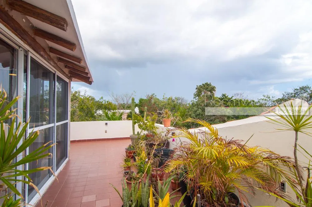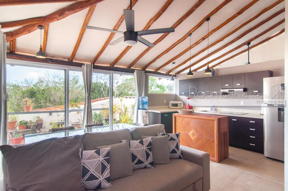 The home is a 3-minute walk from the marina and restaurants in Puerto Aventuras. It is 300 meters from the beach and 120 meters from the tennis courts. The property is divided into three self-contained units, one on each floor. The lower two floors each contain two bedrooms and two bathrooms. The top floor is a large studio penthouse with a private rooftop. Each floor features a full kitchen with an island, a walk-in closet, and a private balcony or terrace.