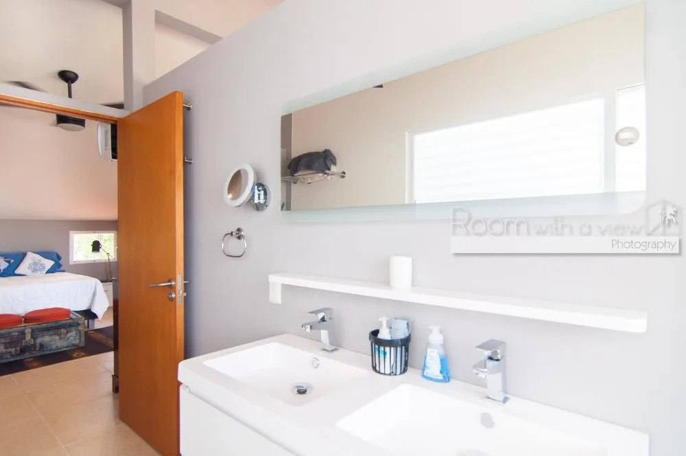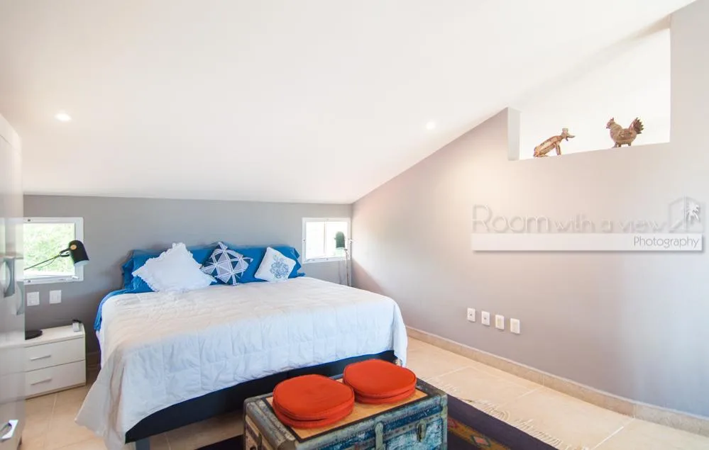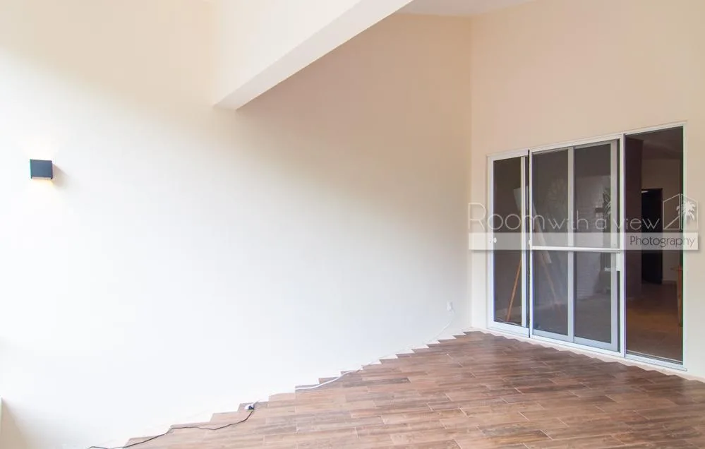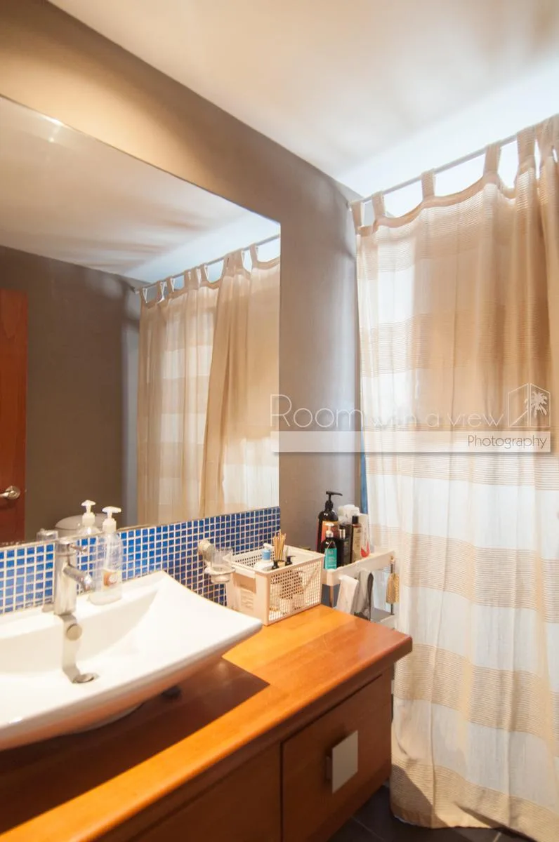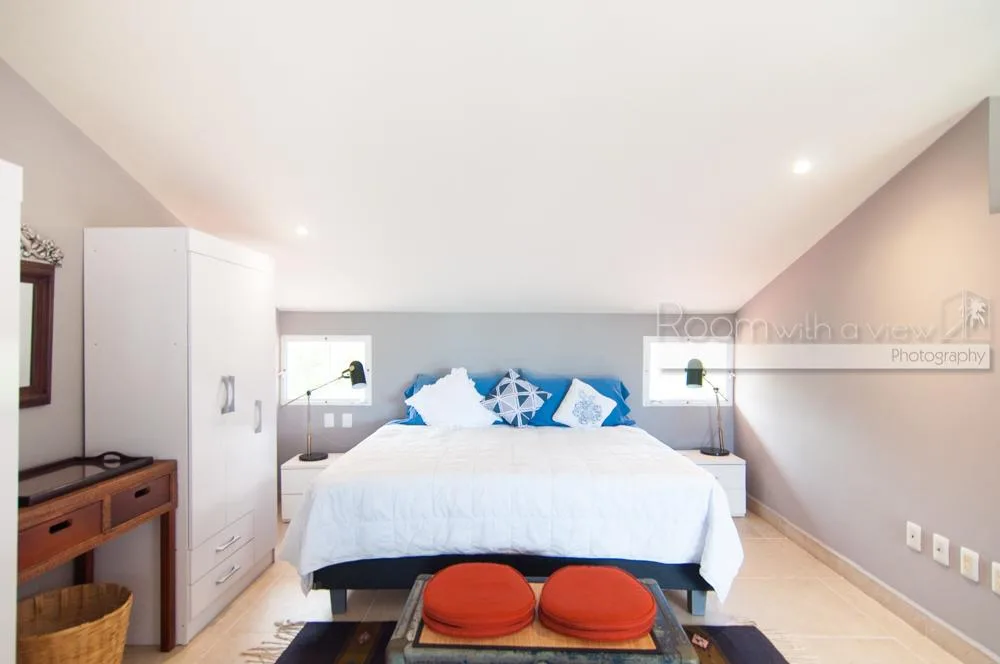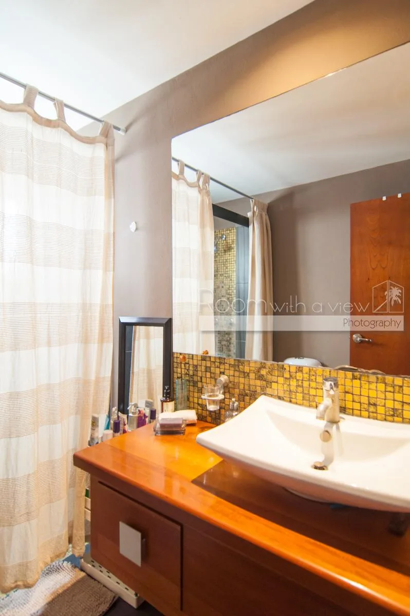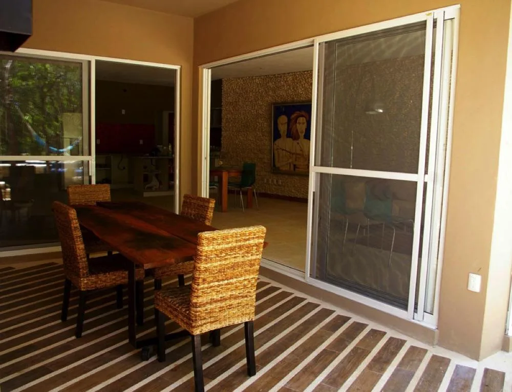 The home is a 3-minute walk from the marina and restaurants in Puerto Aventuras. It is 300 meters from the beach and 120 meters from the tennis courts. The property is divided into three self-contained units, one on each floor. The lower two floors each contain two bedrooms and two bathrooms. The top floor is a large studio penthouse with a private rooftop. Each floor features a full kitchen with an island, a walk-in closet, and a private balcony or terrace.