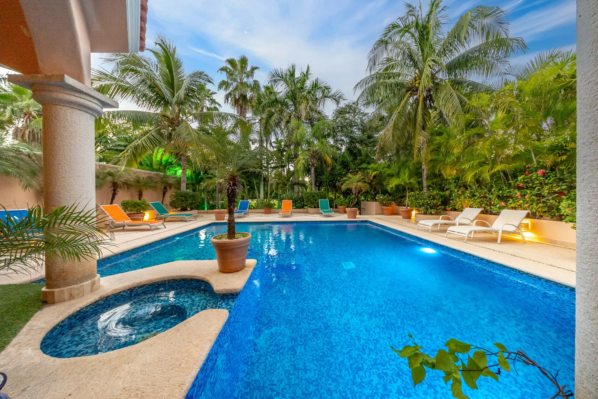 Outdoor living is a defining feature. The backyard is centered around a large swimming pool with a built-in spa, surrounded by expansive decking, lush tropical gardens, and open views toward the golf course. Covered terraces supported by stone columns provide shaded lounge and dining areas.