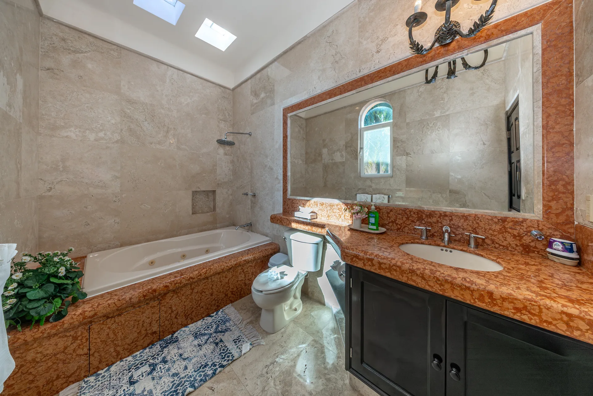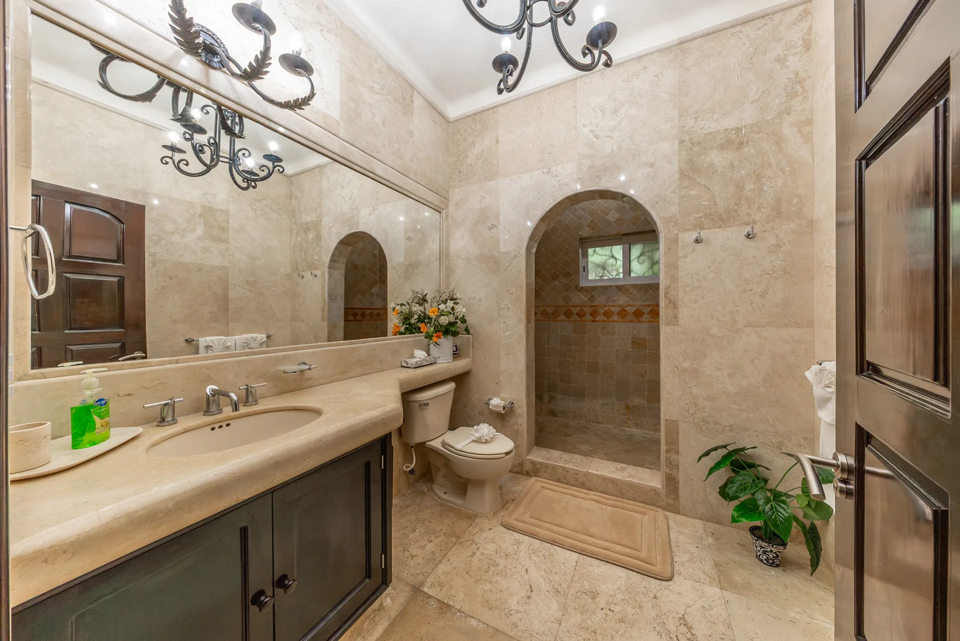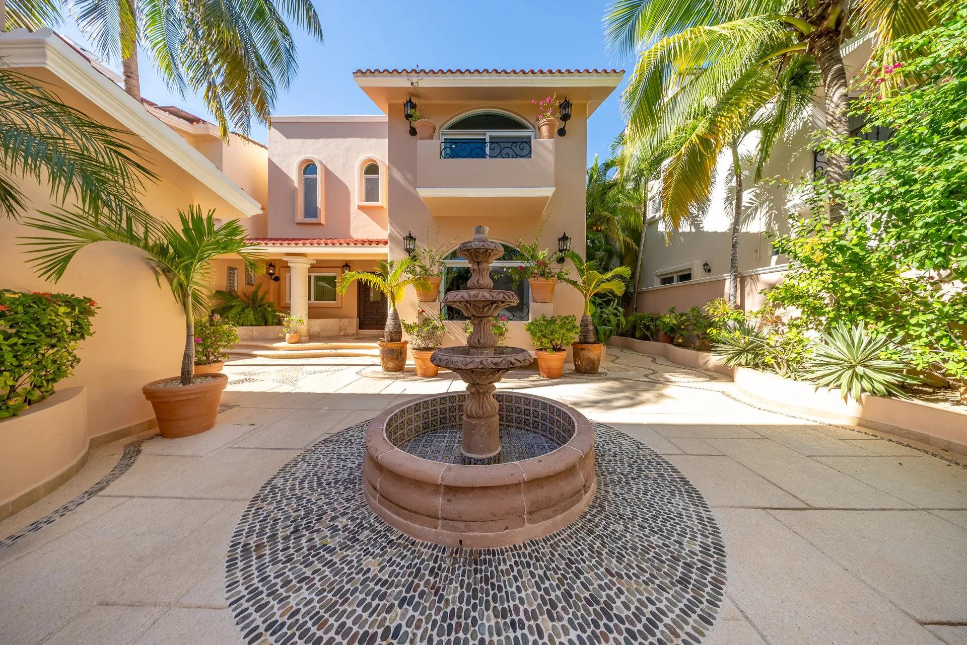 Arrival is marked by a refined entrance courtyard with a central fountain, framed by elegant architectural lines and lush greenery. The home showcases marble flooring throughout, graceful archways, and solid wood finishes. The living areas are bright and inviting, featuring custom built-in seating, high ceilings, and large openings that connect seamlessly to the outdoor terraces and pool area.