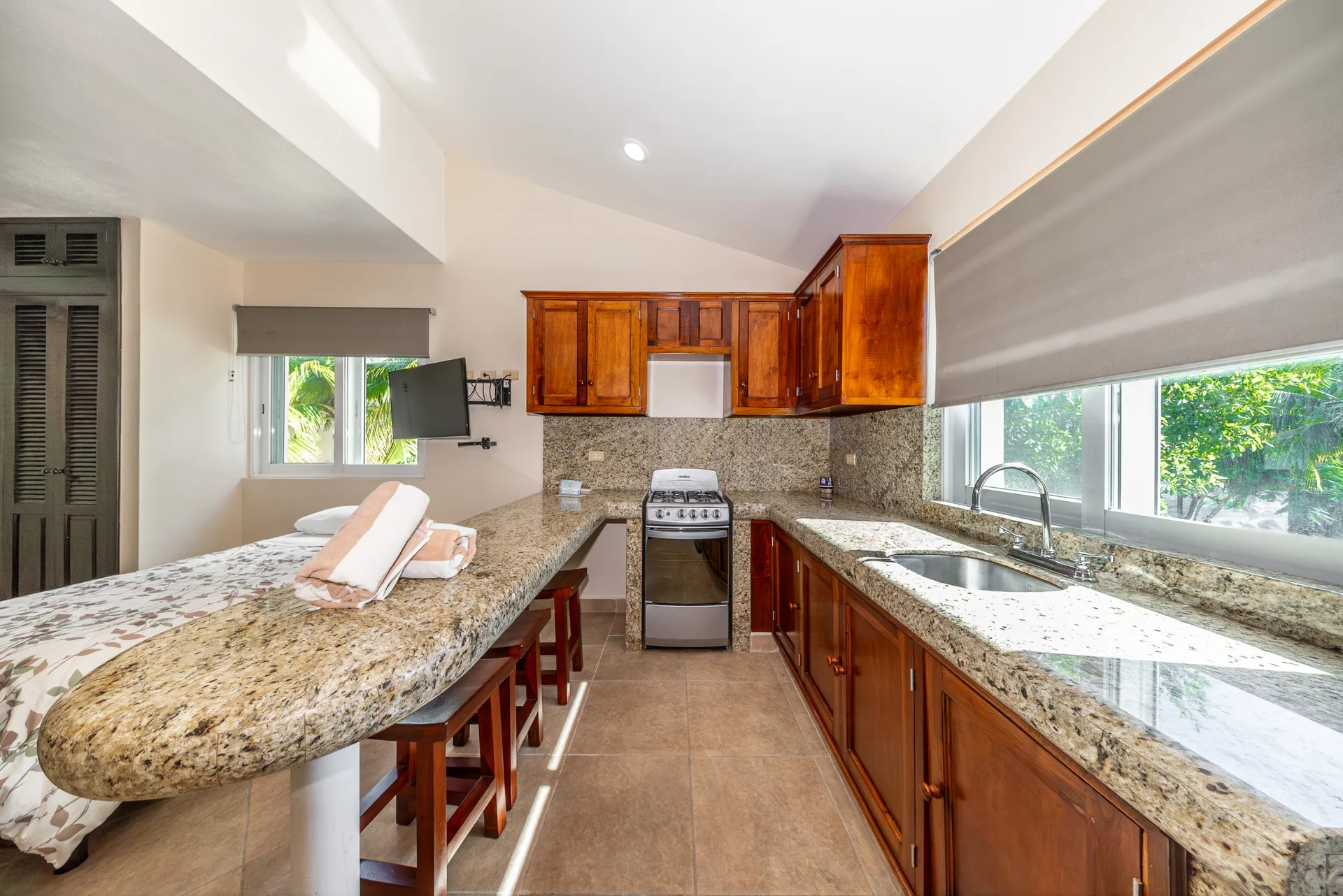The home also features a rooftop terrace, offering additional open-air space for relaxation or sunset views. The property is fully furnished and equipped with solar panels.