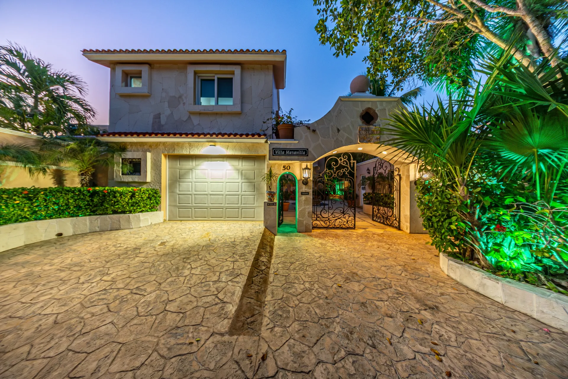 Villa Maravilla is a golf-front residence located within the gated community of Puerto Aventuras. The home features timeless architecture, generous living spaces, and a private resort-style setting. It is thoughtfully positioned on the golf course and surrounded by mature tropical landscaping, creating a tranquil atmosphere with excellent privacy.