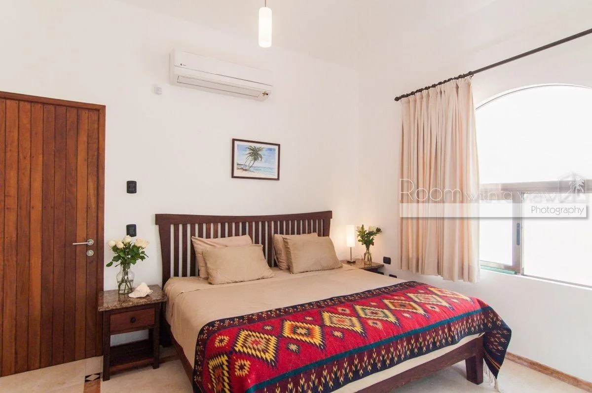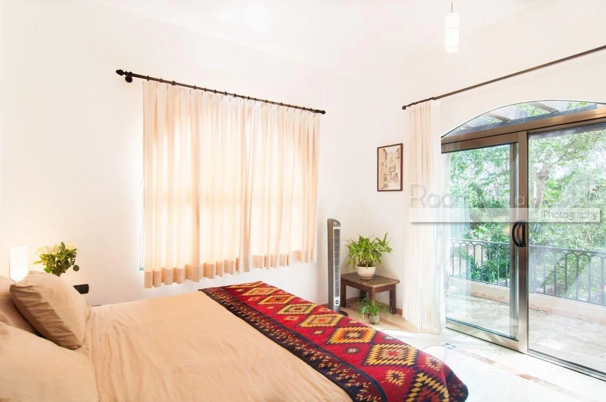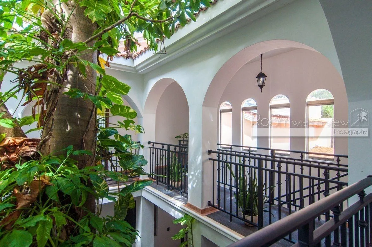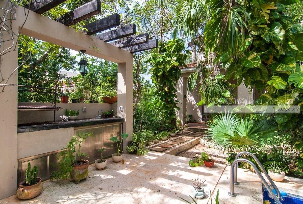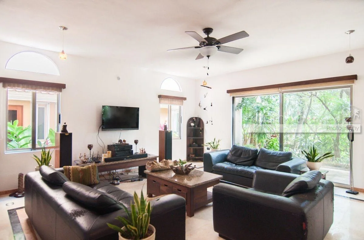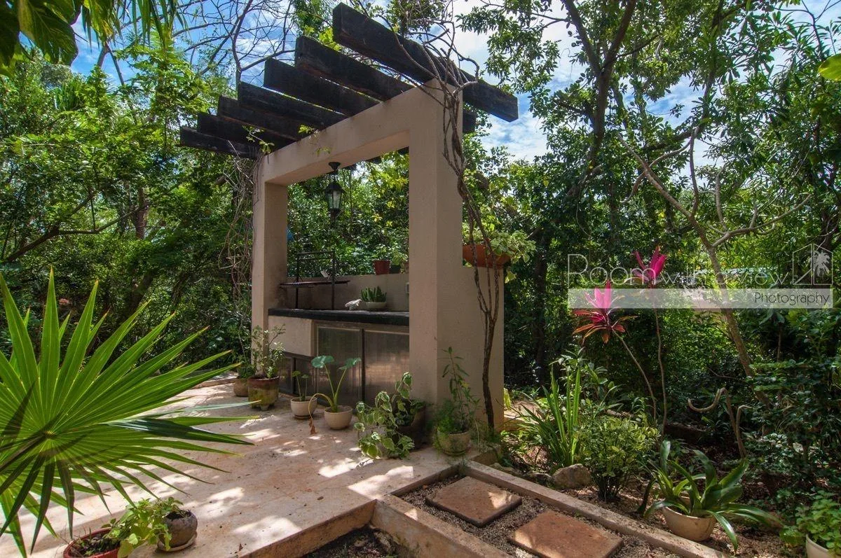 This expansive 6-bedroom home features ample natural light and an open-air atrium with a large tree and a fountain. The main floor includes a bright living room, a dining area, and a full kitchen with a breakfast bar and premium appliances. Finishes consist of high-quality natural materials such as Tzalam wood, marble, granite, and Cantera stone. The upstairs bedrooms open onto private balconies with sweeping views. The home is equipped with solar panels, a dedicated water purification and softening system, ceiling fans, air conditioning, hurricane shutters, and an alarm system.