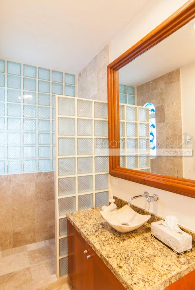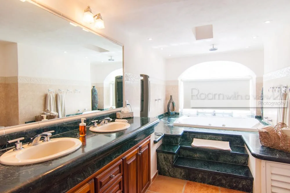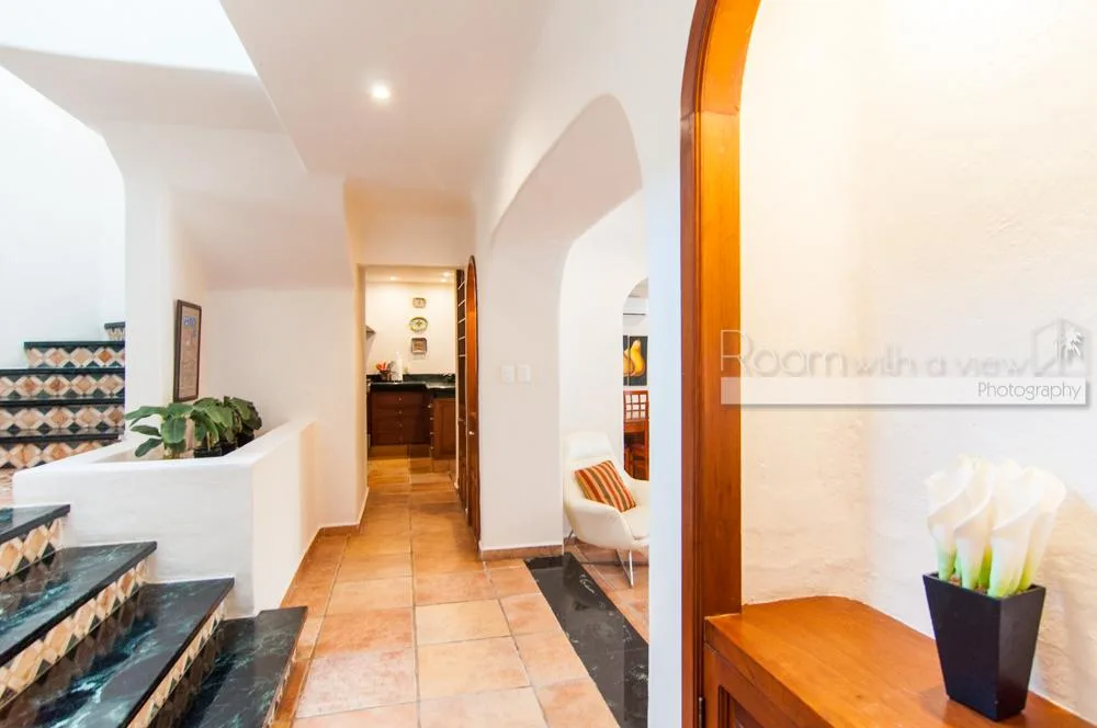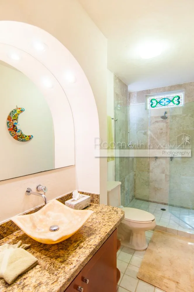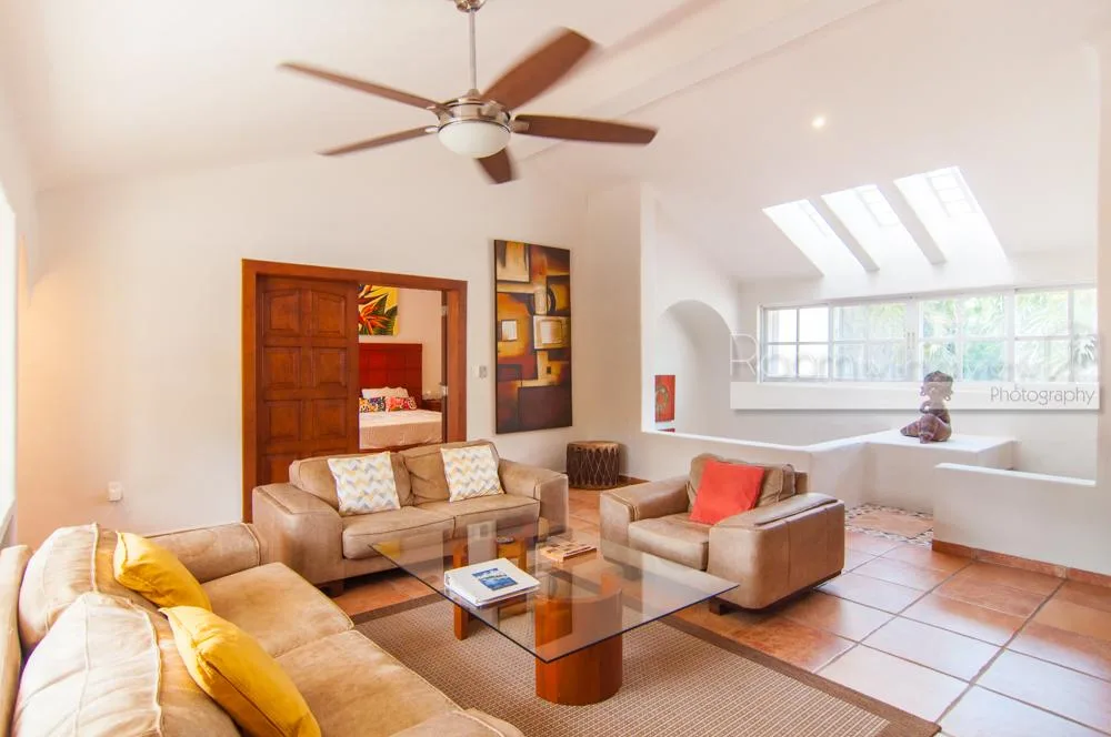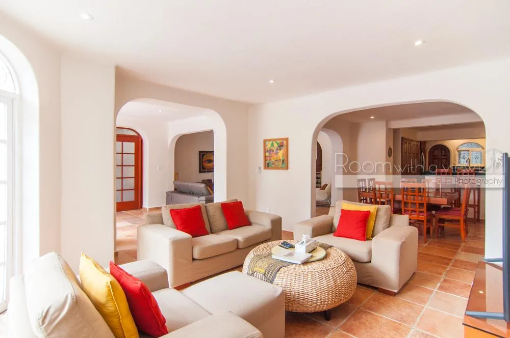 The updated two-story villa features cathedral ceilings and skylights that fill the spacious interiors with natural light. The main house includes 4 bedrooms and 3. 5 bathrooms. A separate 1-bedroom, 1-bathroom guest casita provides additional accommodation.
