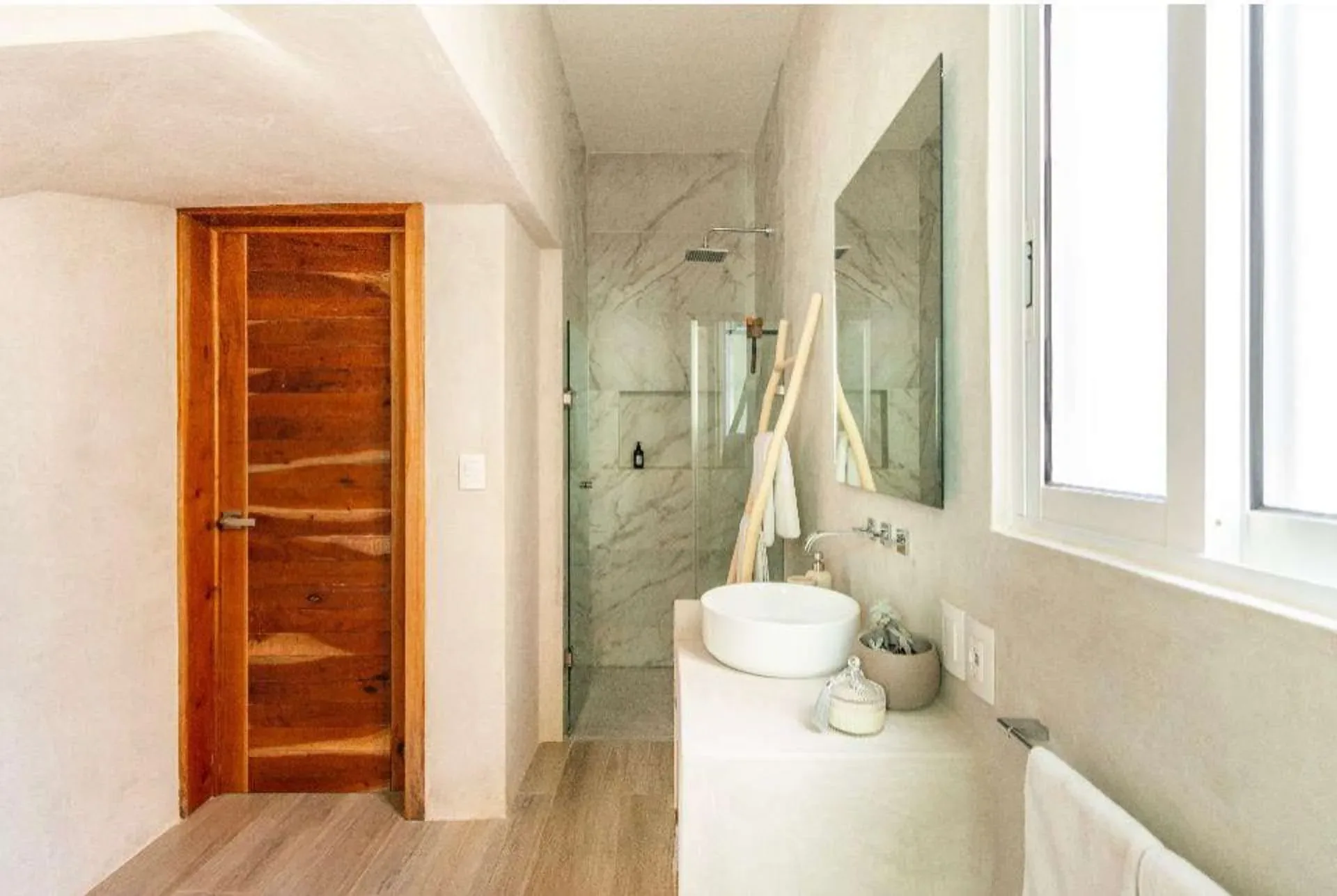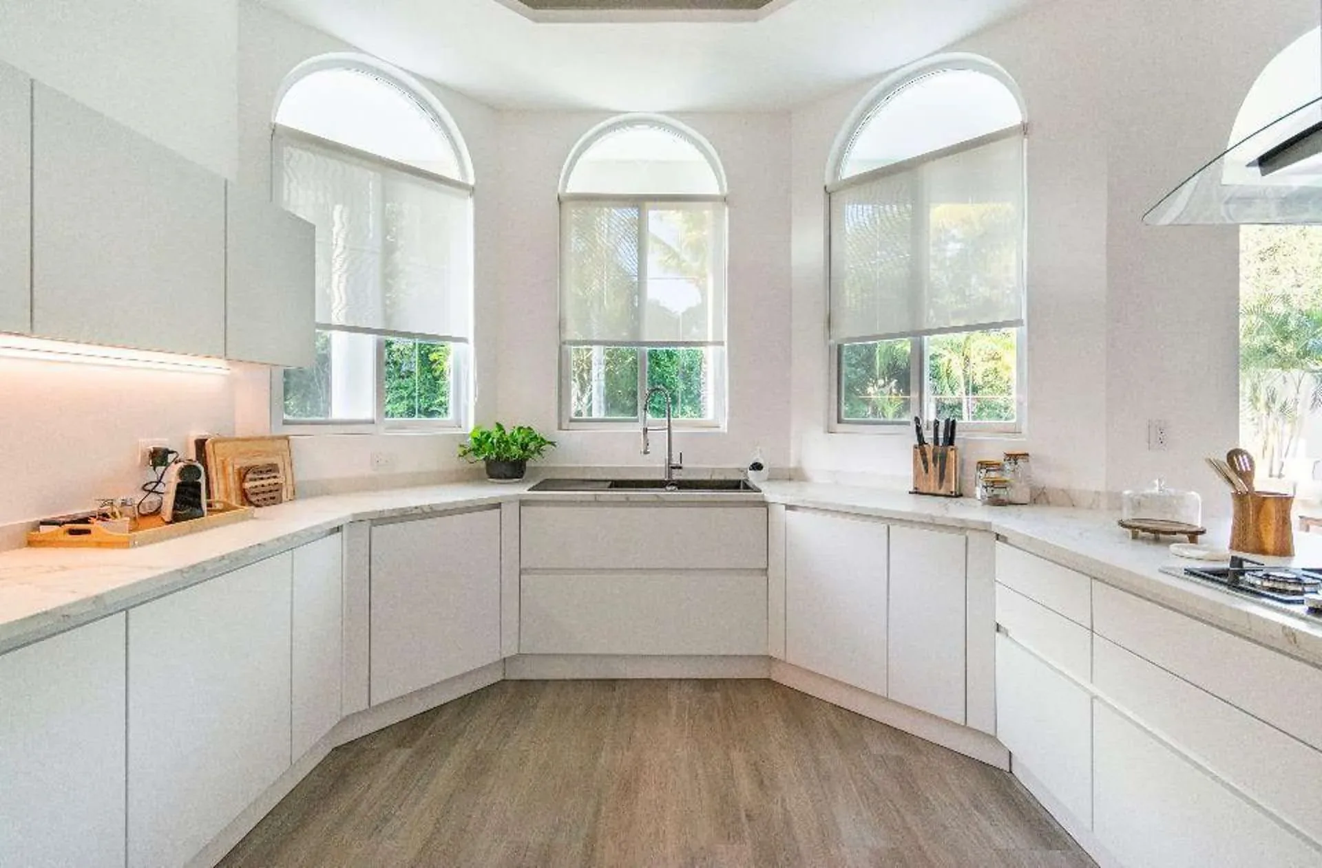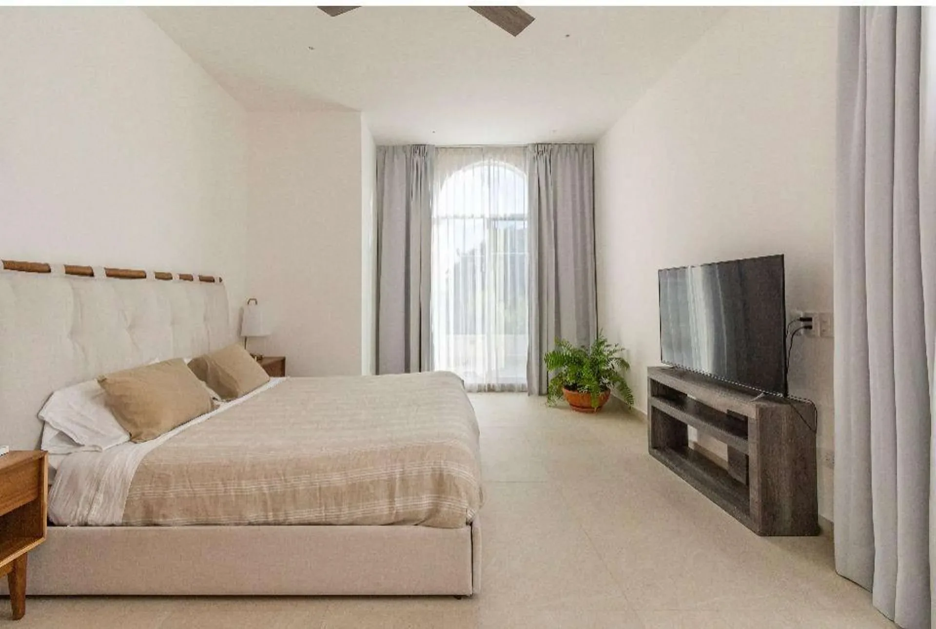 The property features four bedrooms and five bathrooms in the main house, accompanied by a separate one-bedroom guest house. The contemporary interiors are finished with marble and light woods, and the residence comes fully furnished with high-end appliances.