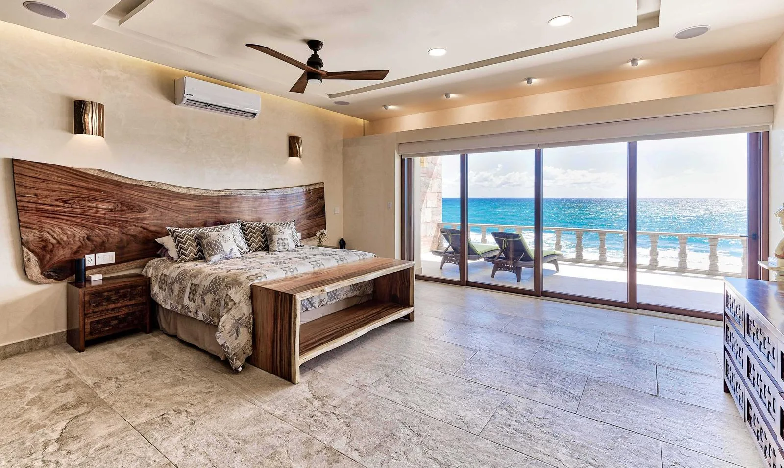 Outdoor amenities include a glass-tiled infinity pool with submerged seating and a jacuzzi accommodating six people. The exterior also features a terrace and patios with sea views, a grill and fire pit area, a private beach with direct access, hammocks over the water, palapas for shade, two bicycles, and kayaks.