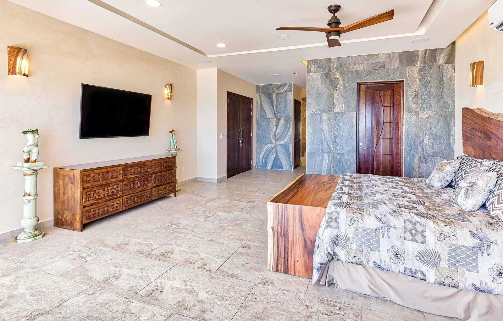 The property offers five bedrooms, including two master suites with king beds and three bedrooms with double beds. There are five full bathrooms and one half bath, all equipped with luxury finishes and rain showers.