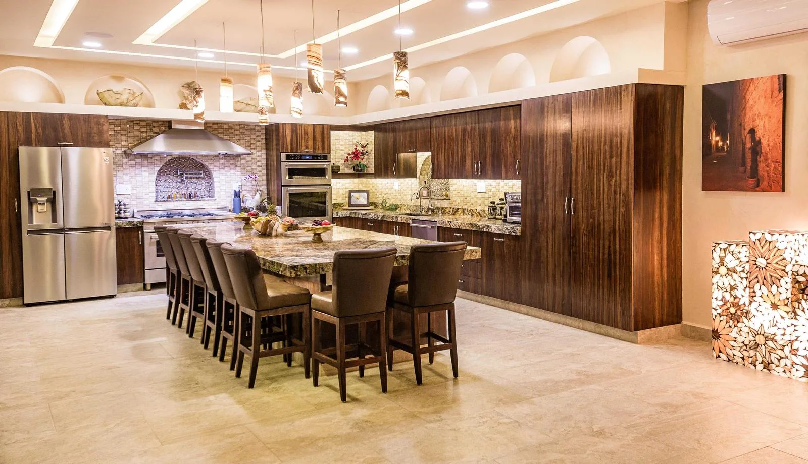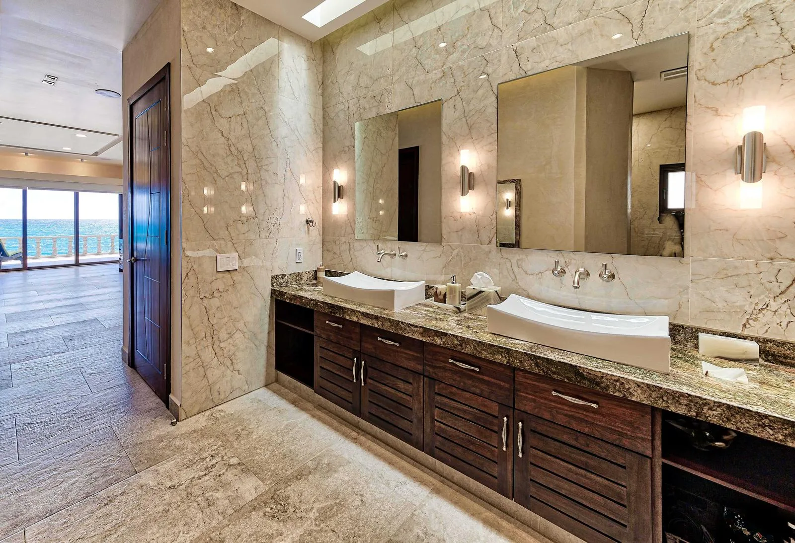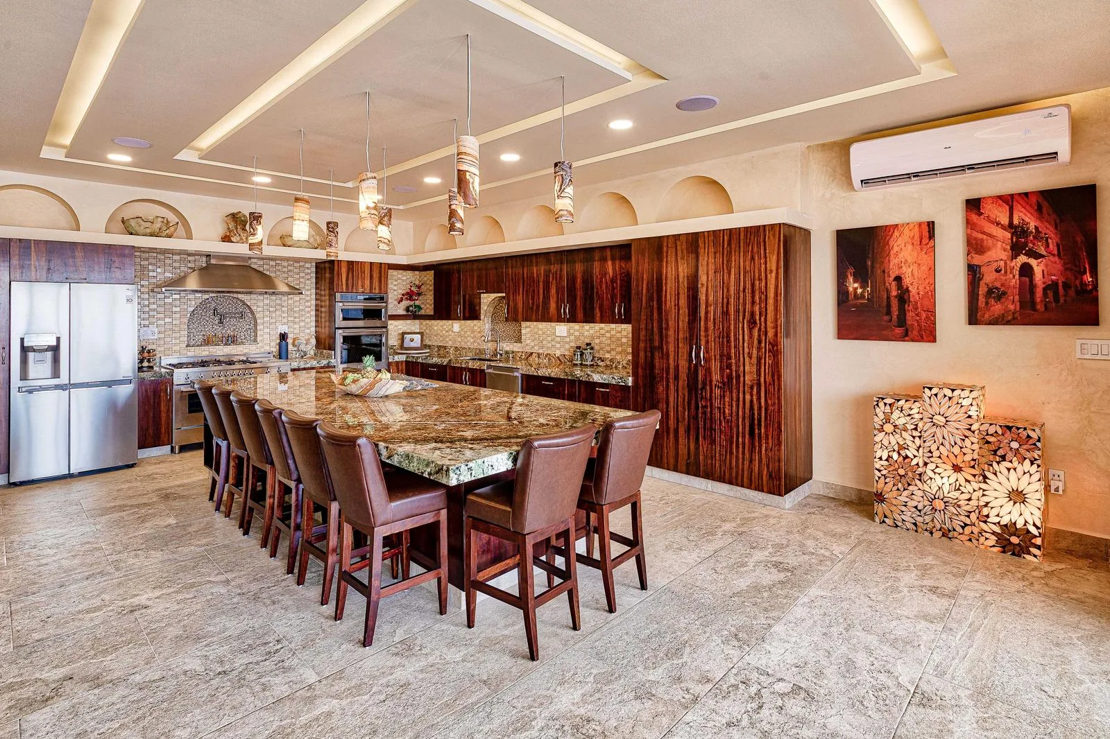 The spacious chef's kitchen includes a 13-foot island, three ovens with one for baking, a dishwasher, and high-end appliances. The living area provides open spaces with panoramic sea views and integrated technology.