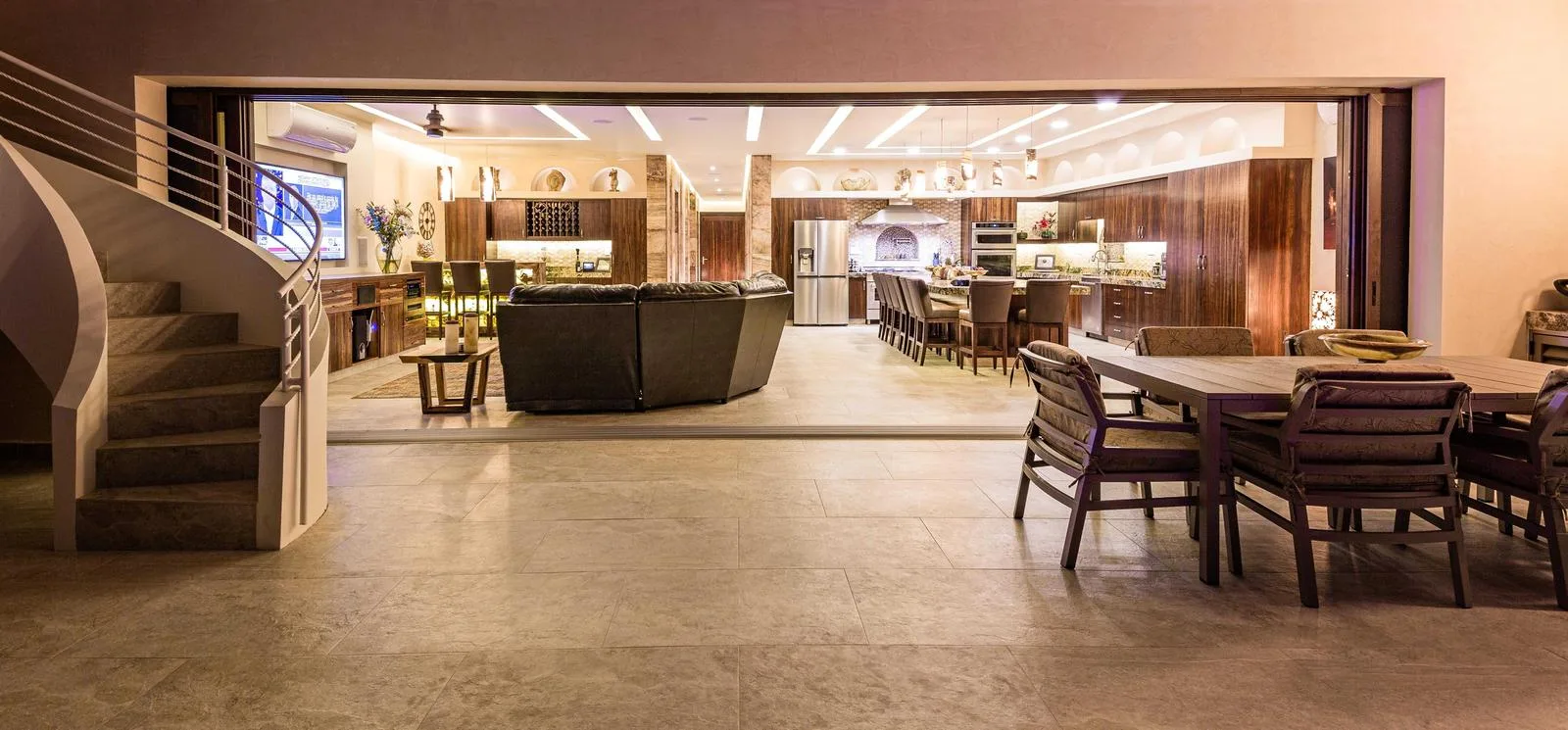 Interior features comprise a surround sound system with voice controls, smart TVs in each bedroom, high-speed Wi-Fi, individual air conditioning, an equipped gym with weights and a stationary bicycle, a spacious pantry, and a laundry room with premium equipment.