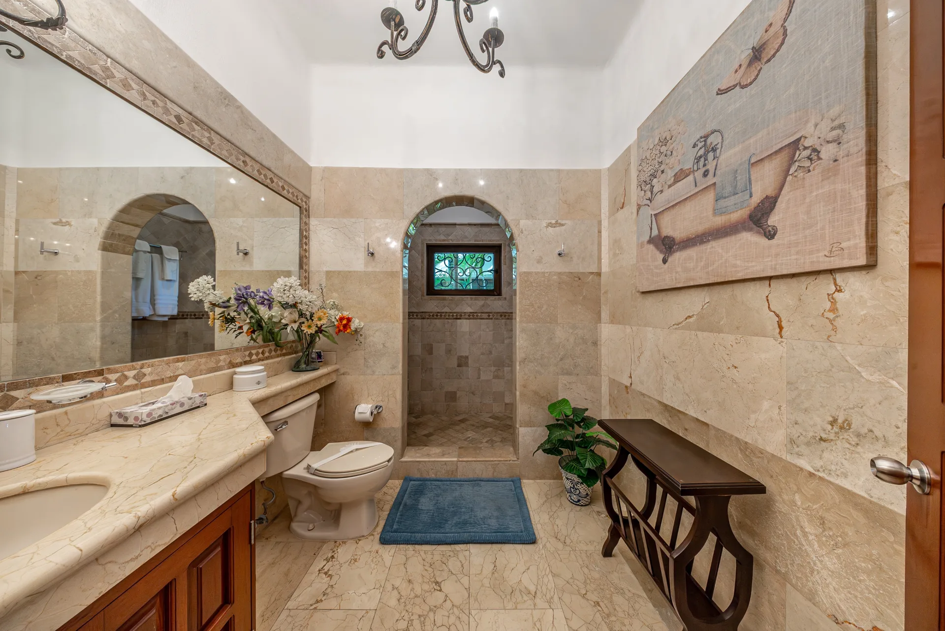 Villa Orquídea is a meticulously crafted estate located in a prime golf-front position within the gated community of Puerto Aventuras. Handcrafted wrought iron gates and sculpted stone masonry open into a refined entrance courtyard. Mature tropical gardens with palms and birds of paradise surround the home, creating privacy and a tranquil atmosphere.