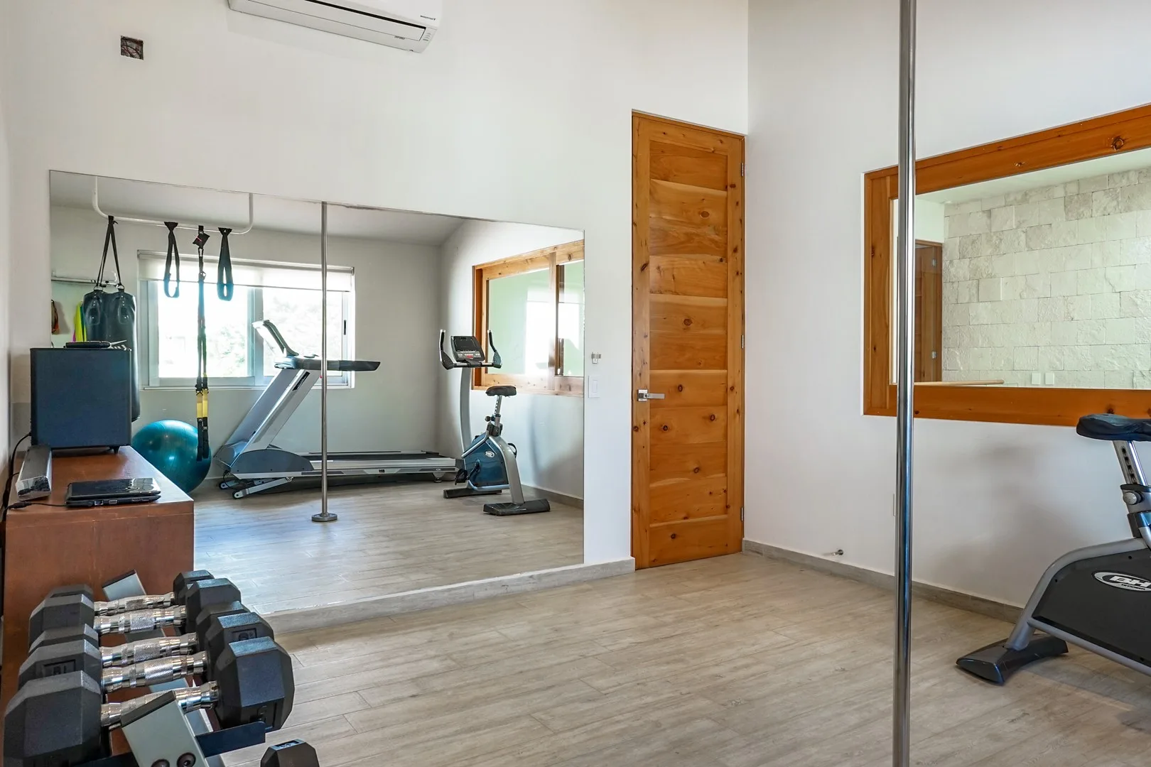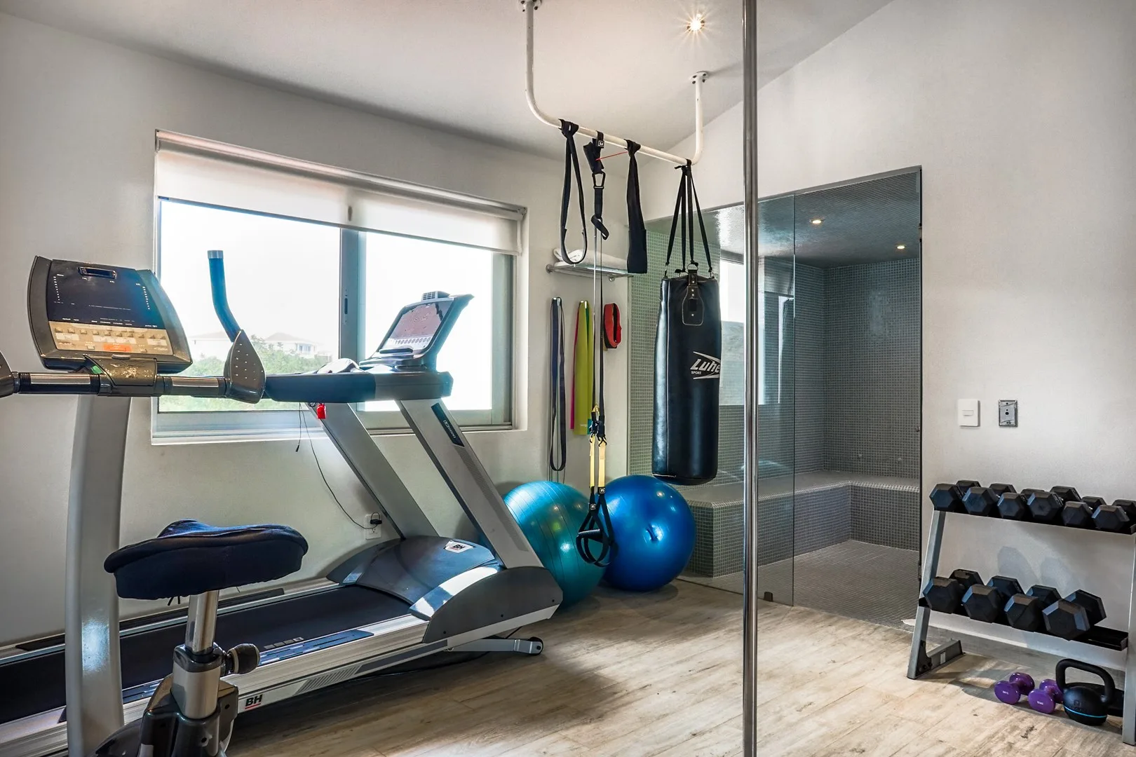 The interior includes an open-plan living and dining area. A large, equipped kitchen features quartz countertops and quality appliances. There are three spacious bedrooms, each with its own ensuite bathroom, complemented by three and a half bathrooms in total. Additional interior spaces consist of a private gym and a steam room.
