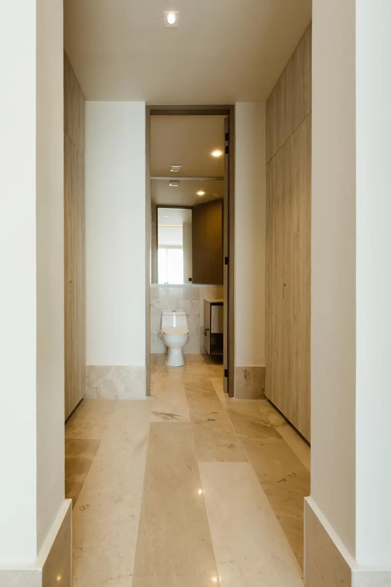 The property amenities include a private beach, a 24/7 security lobby, a pool, a sun deck, a gym, a yoga area, and social areas with grills. On the rooftop, there is an infinity pool with sea views, a terrace, bathrooms, and showers. The building has elevators and parking.