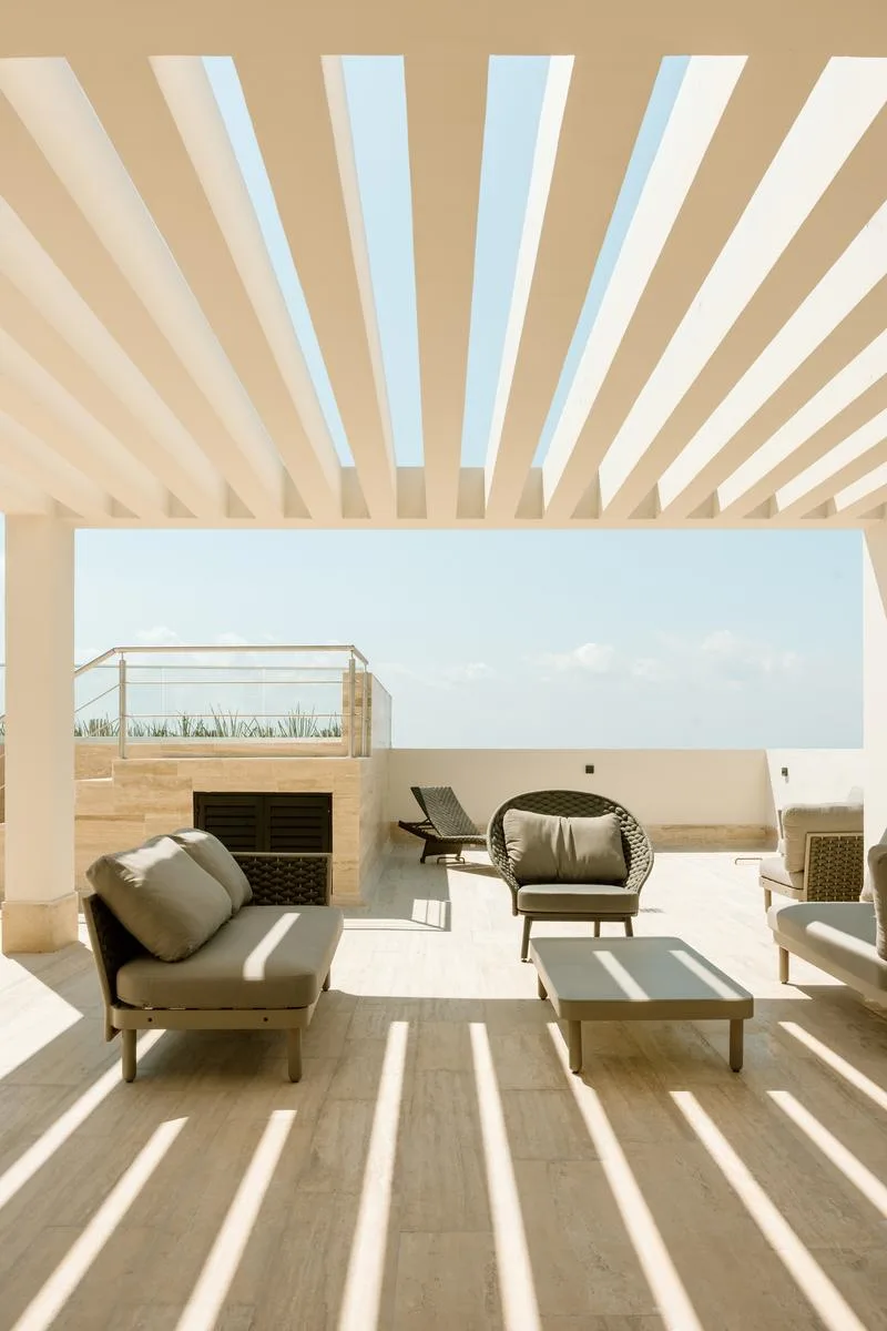 This beachfront apartment is situated in Puerto Morelos, Riviera Maya, featuring design with local materials and views of the Caribbean Sea.