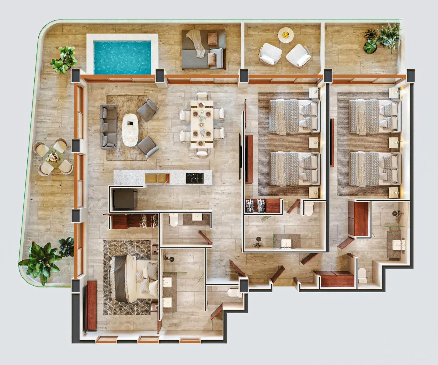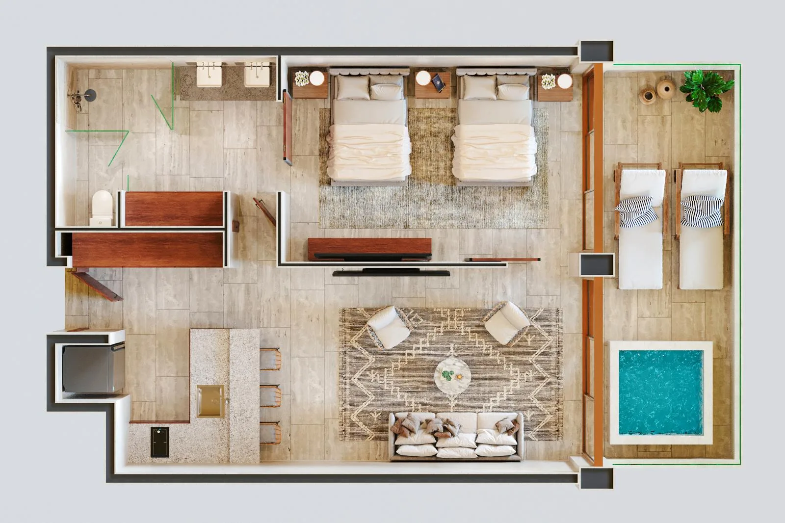 There are 73 fully furnished and equipped oceanfront condos. The design emphasizes detail and sensory appeal.