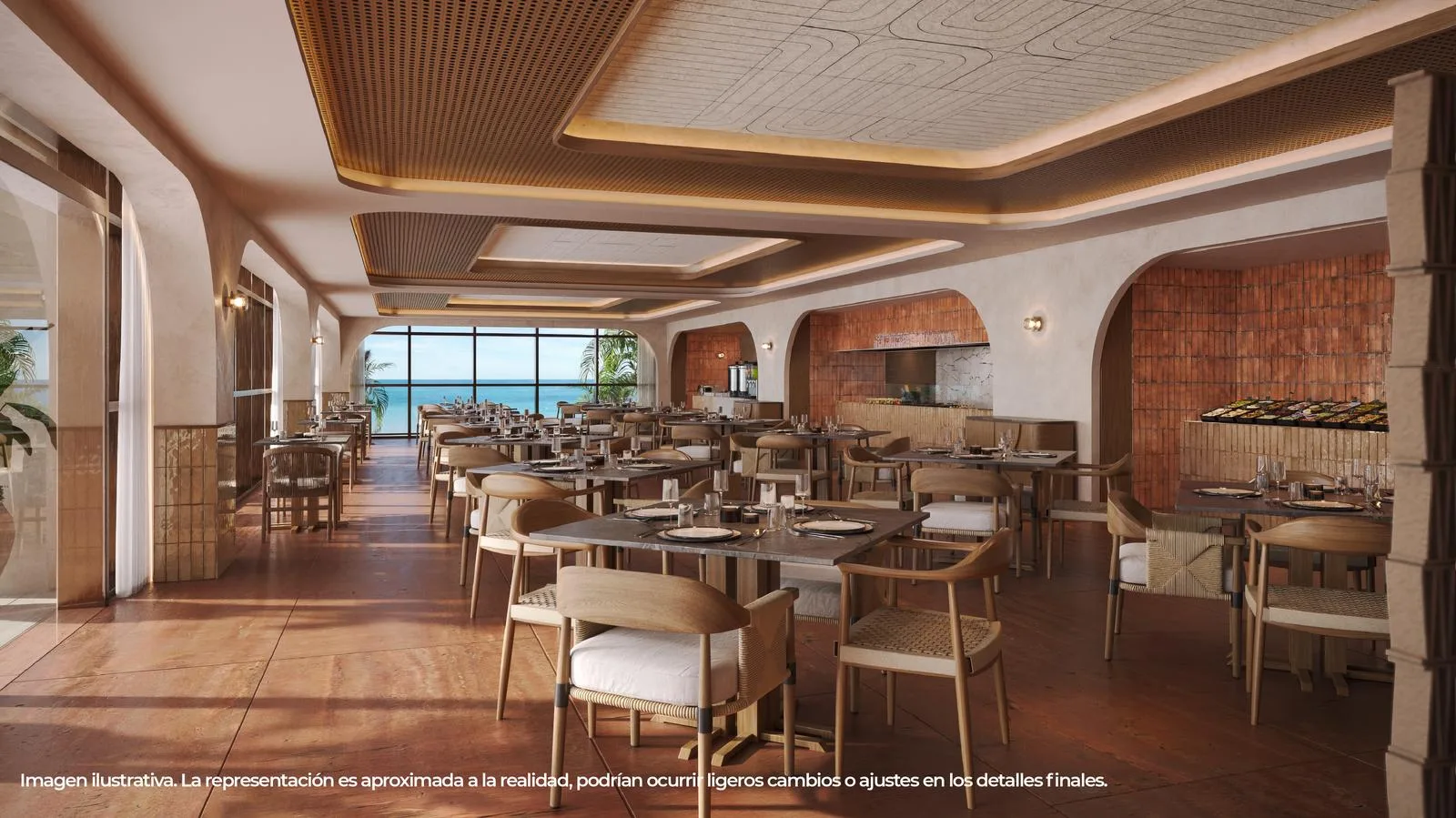 The building offers an infinity pool facing the sea, a rooftop sky bar with panoramic views, a restaurant, a snack bar, and a lobby bar. Amenities include a spa with a temazcal and jacuzzi, a gym, and yoga areas. Residents have private access to a beach club. Available services include a spa concierge, room service, and housekeeping. The property provides 24/7 security, concierge services, and condotel management.