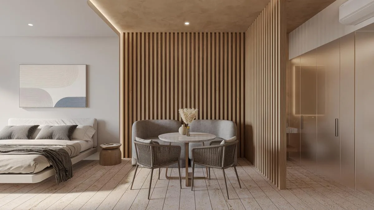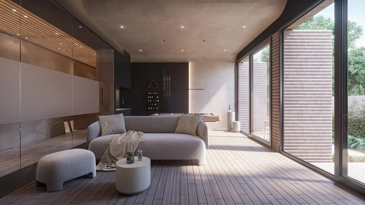 Amenities at the development encompass a private beach club with sunbeds and palapas, an infinity pool facing the sea, and a gym with a swimming lane. Additional facilities include a paddle tennis court, a sky terrace and sky bar with a jacuzzi, a restaurant and room service, and a wellness area with a sauna and spa. There is also a coworking space, a game room, a fire pit and lounge, and a lobby with concierge and valet parking. Internal transportation and electric bicycles are provided, along with kayaks and paddle boards, and 24/7 security.