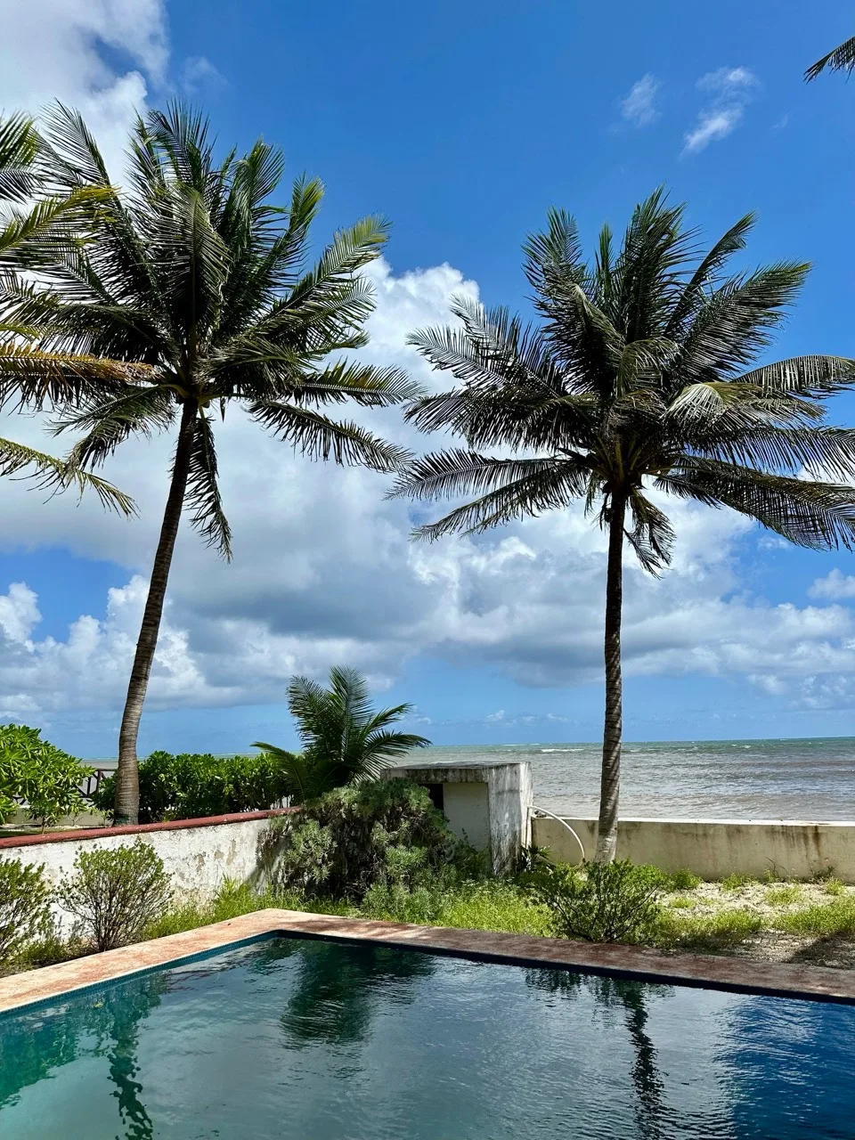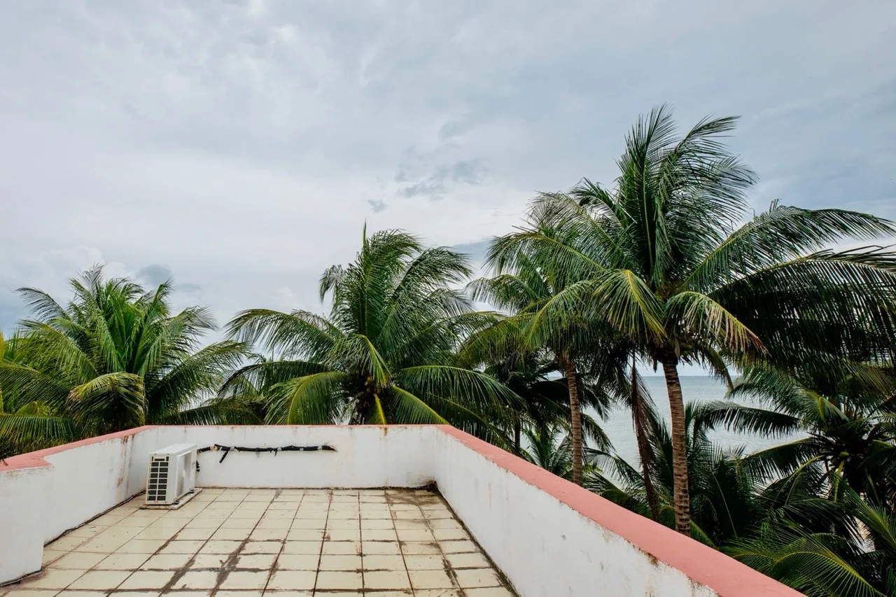 The property includes an expansive private garden, which is rare for a beachfront home in the area. The rooftop is structurally prepared for future expansion. Outdoor amenities include a private pool and a shaded terrace surrounded by palm trees.