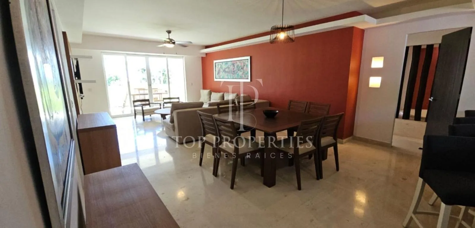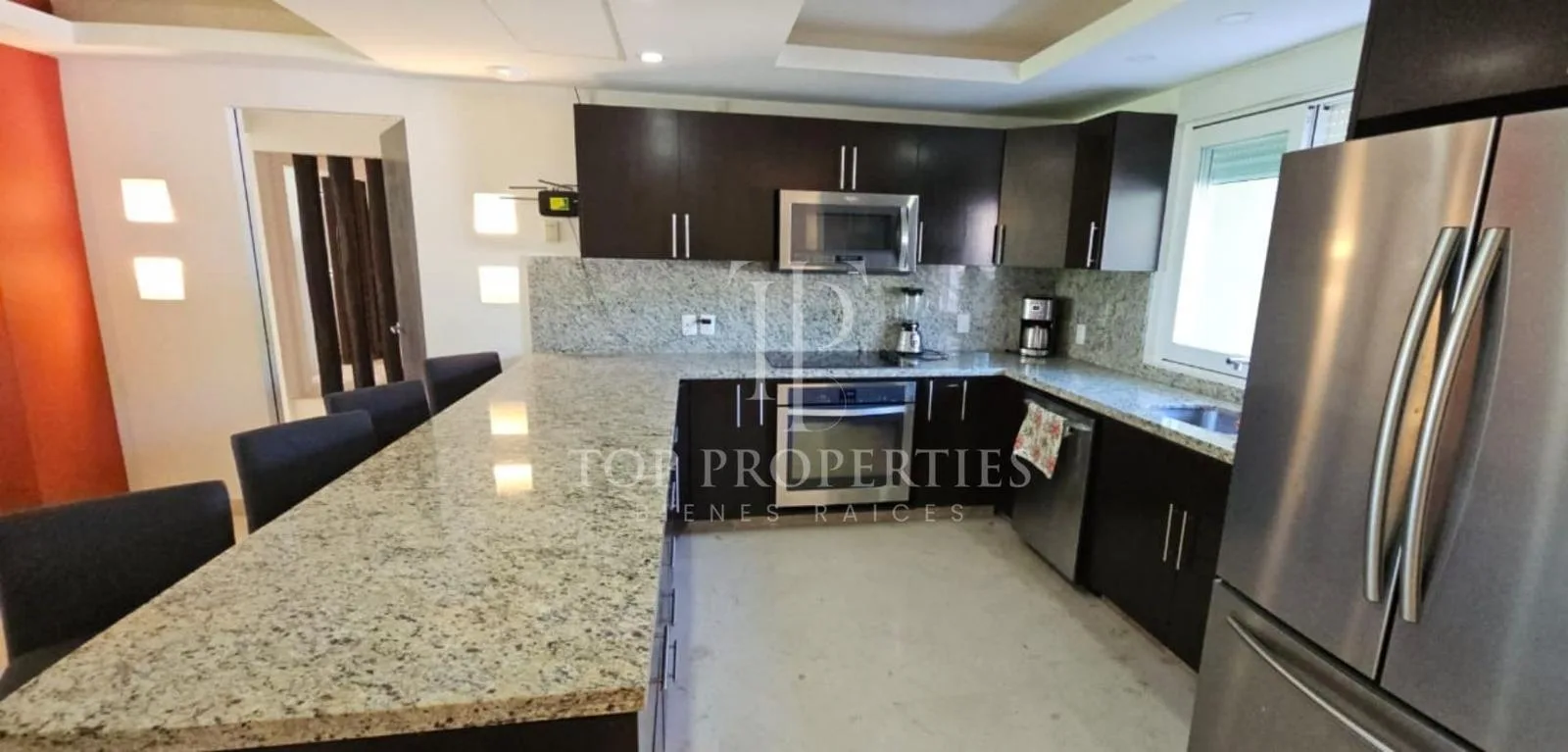 At the rear of the apartment, there is a living room with seating for six and an entertainment area with a 60-inch smart TV. There is a dining area for eight. The kitchen is fully equipped with an electric grill, a Samsung Inverter refrigerator, a Whirlpool microwave with a range hood, a Whirlpool electric oven, a blender, a coffee maker, granite countertops, a dishwasher, and a full set of dishes and kitchen accessories. The apartment features central air conditioning.