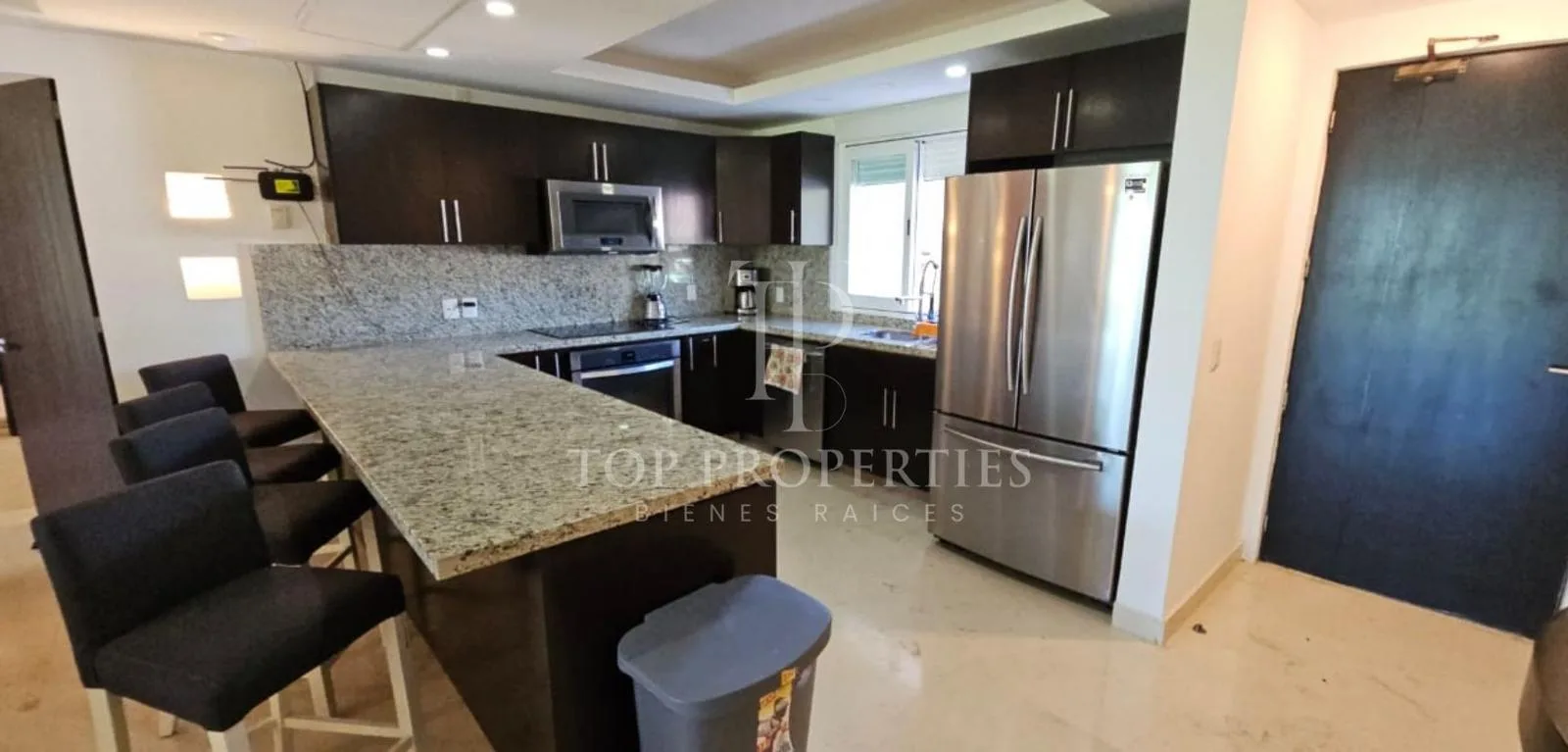 The condominium is situated in Bahia Petempich and offers communal amenities including a swimming pool, security, a lobby, a gym, and an elevator. It provides direct access to the sea. The location is approximately 7 minutes from the tourist zone of Puerto Morelos, 15 minutes from Cancun International Airport, 30 minutes from downtown Cancun, 10 minutes from a large outlet mall, 15 minutes from the Puerto Morelos Maya Train station, and 30 minutes from Playa del Carmen.