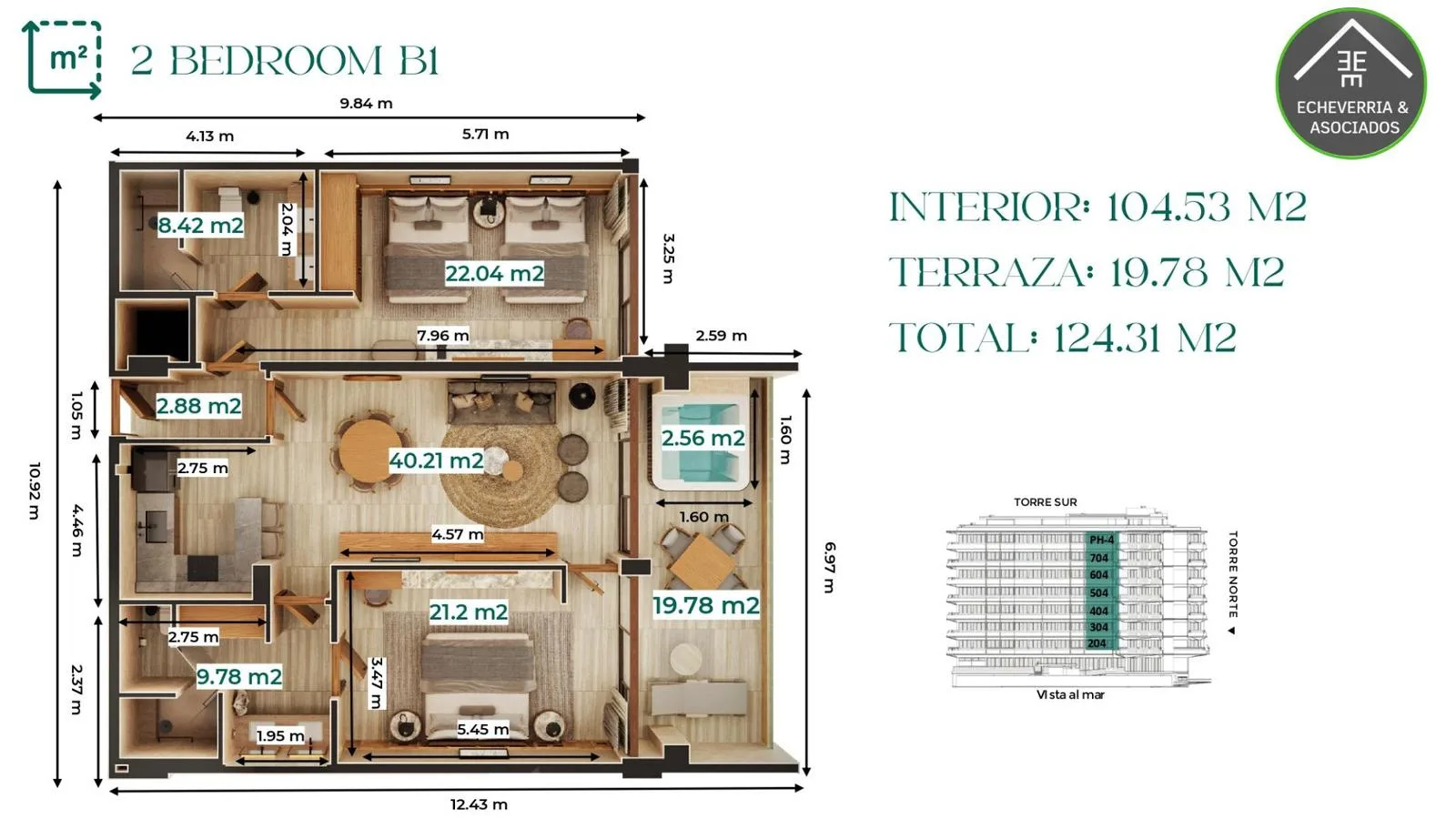This property is a 124. 47 square meter unit featuring two bedrooms. The layout includes a living and dining room, an equipped kitchen, and two bathrooms. The residence features two terraces and incorporates a lock-off system.