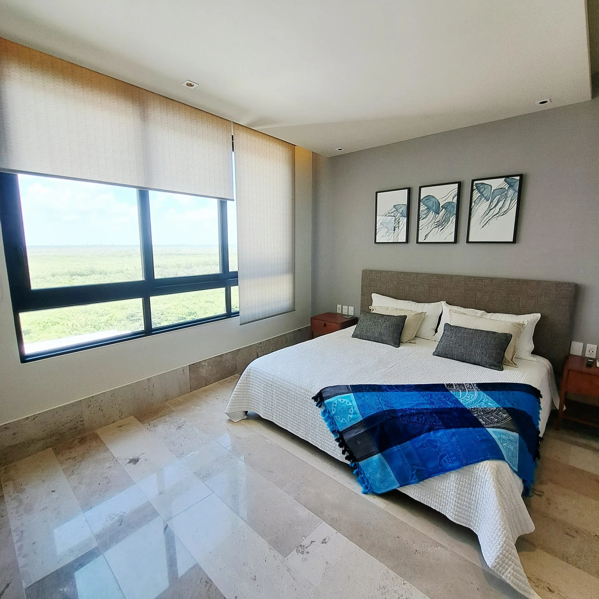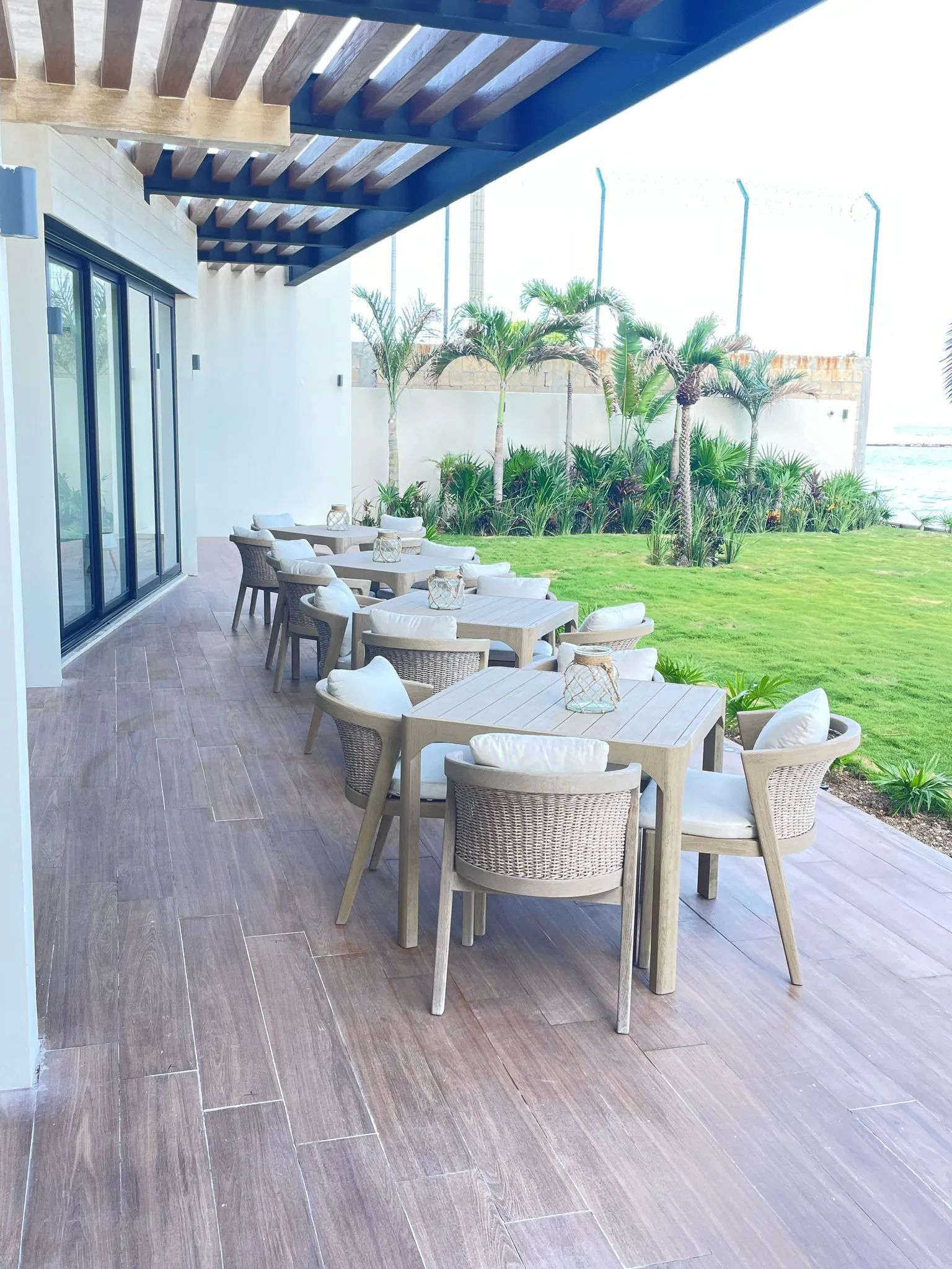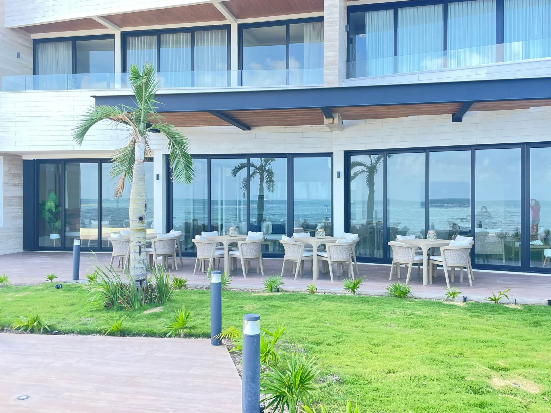 The architecture combines contemporary lines with natural materials, reinforcing the connection between interior and exterior. Floor-to-ceiling windows frame the ocean and allow the sea breeze and sound of the waves to become part of daily life.