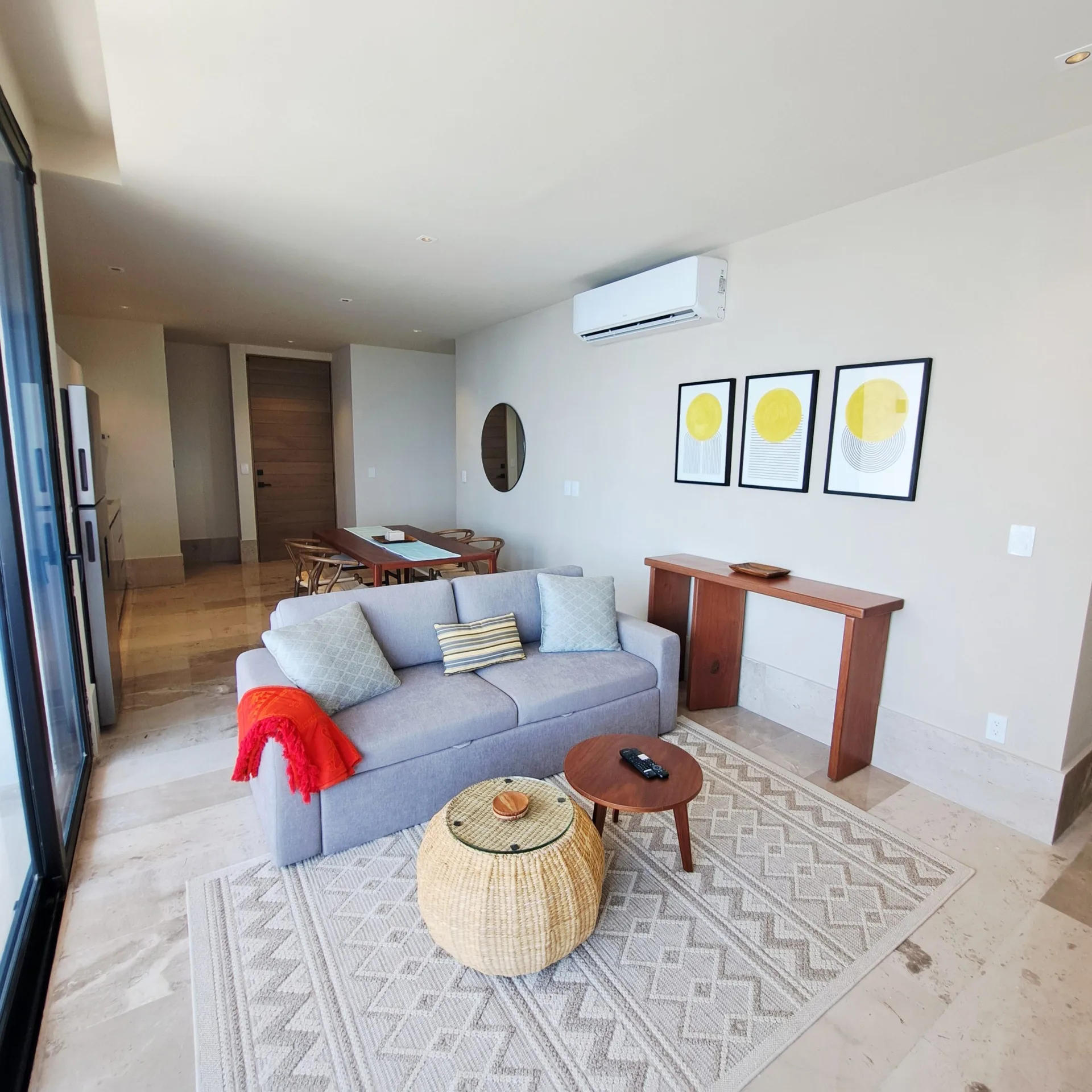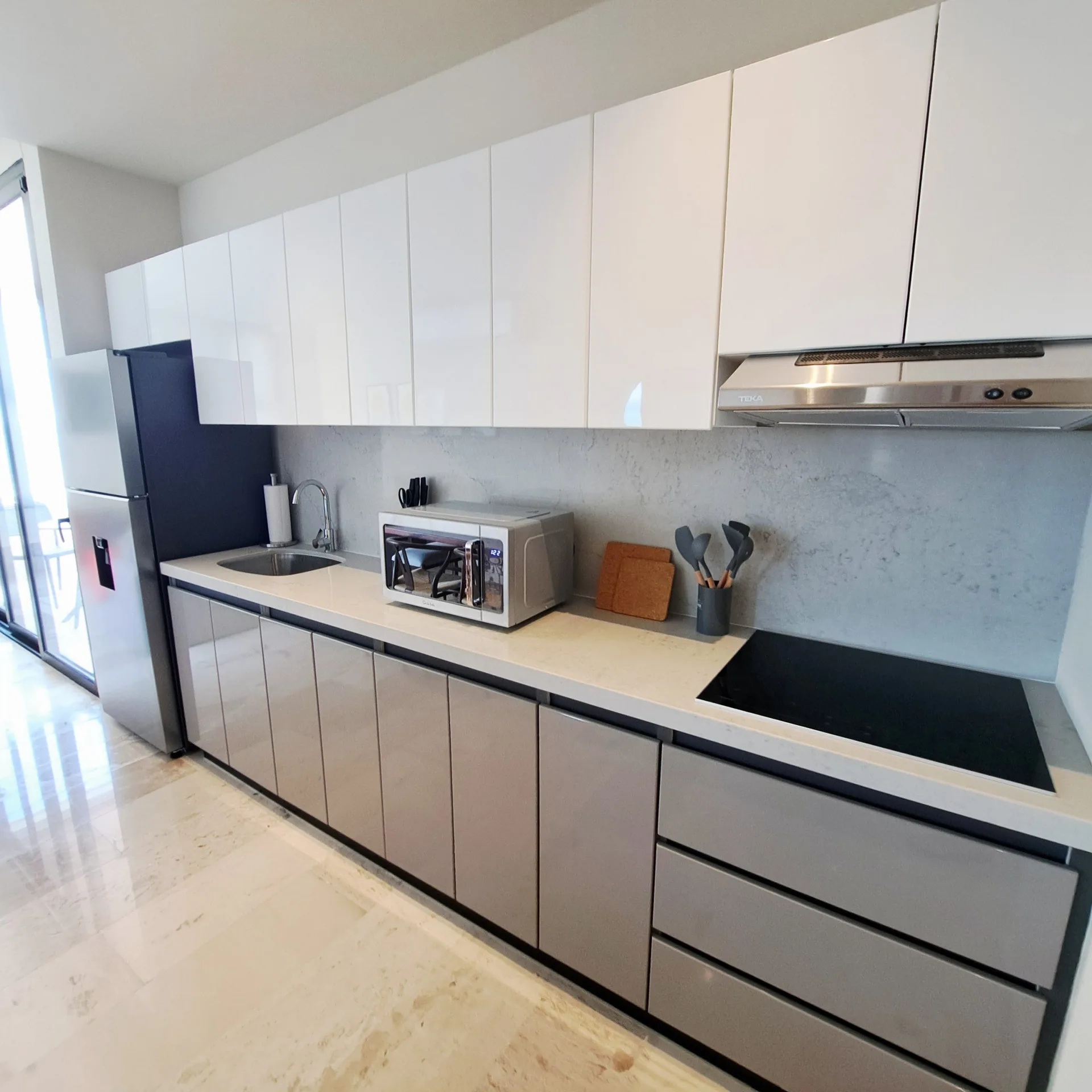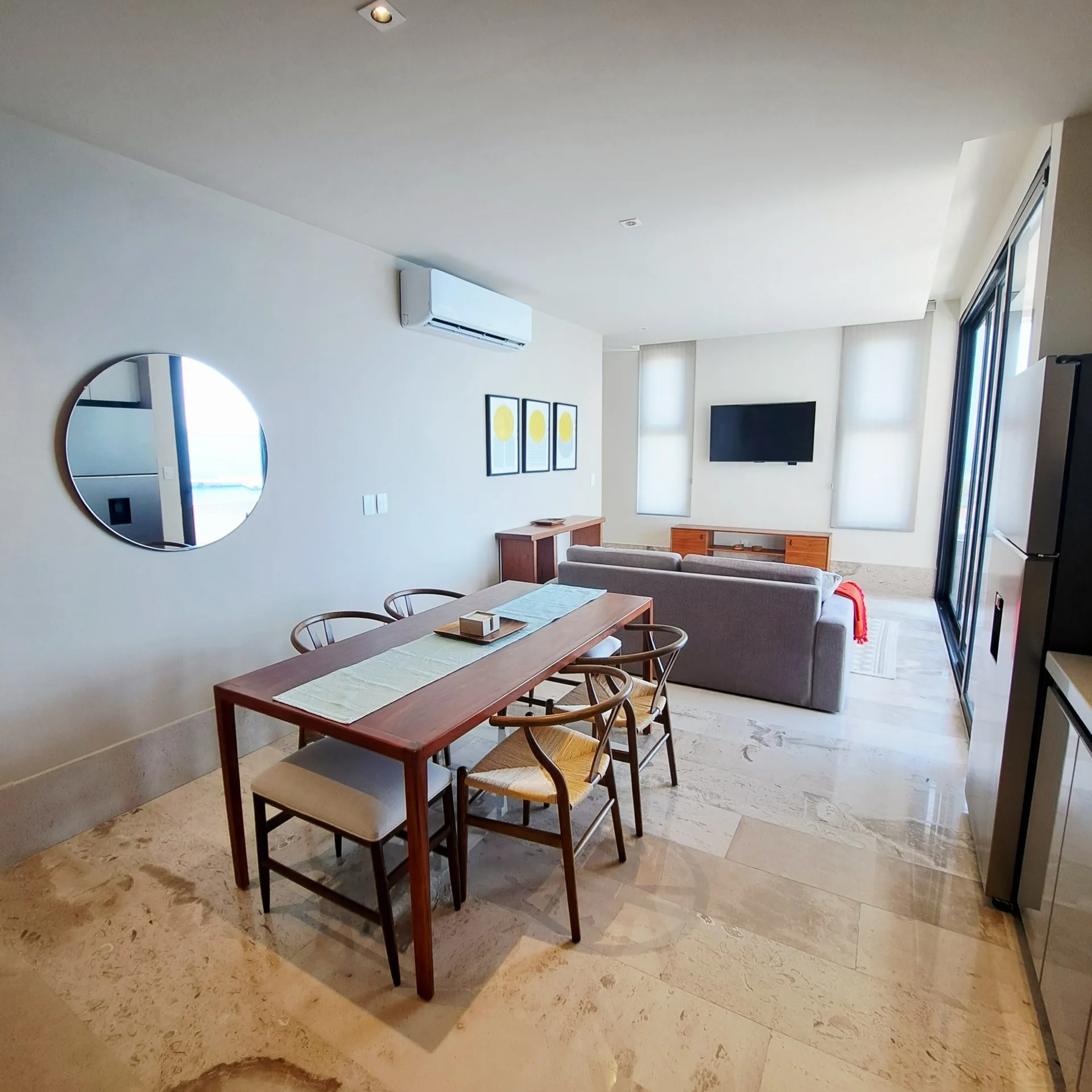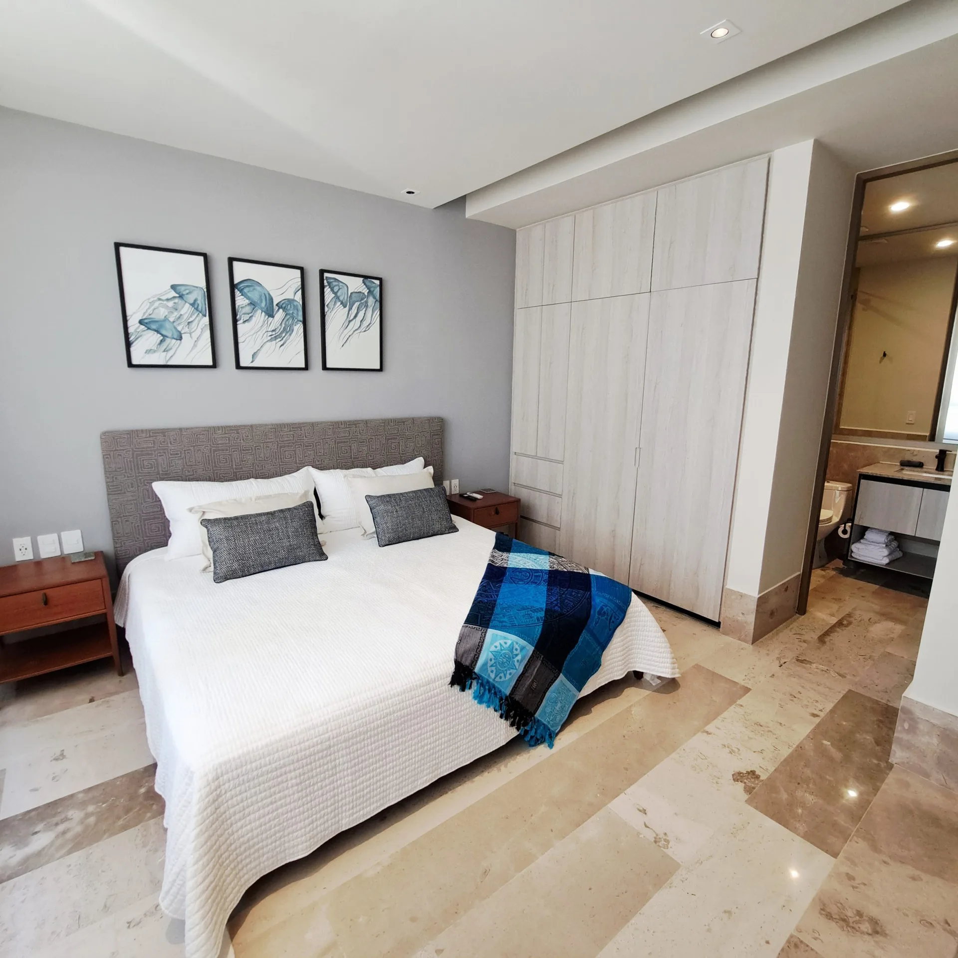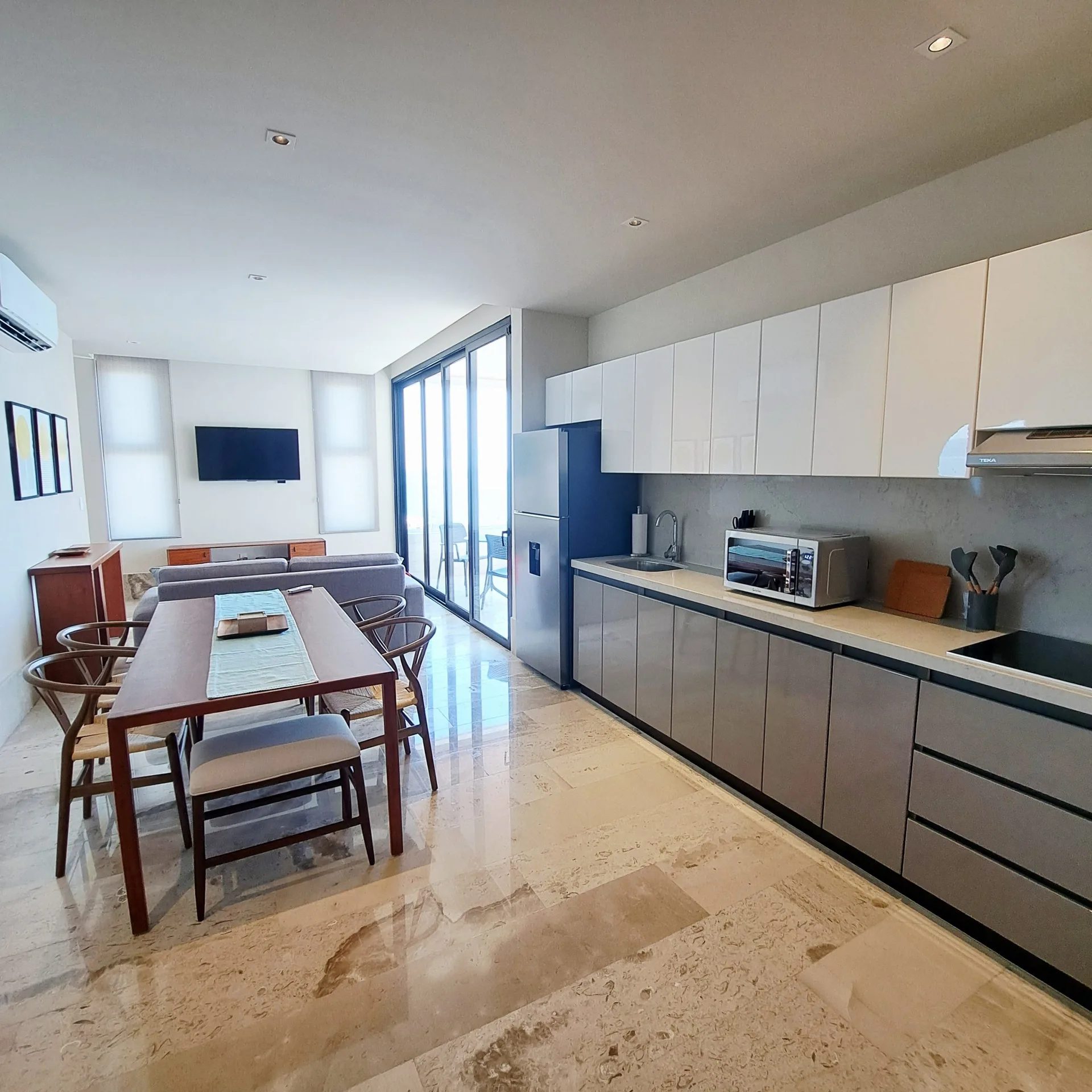 The residence is equipped with two bedrooms and two full bathrooms. It features a walk-in closet, a fully equipped kitchen, a bright social area, and a private terrace where the turquoise sea becomes the central focus. The unit is delivered fully furnished and ready to occupy.