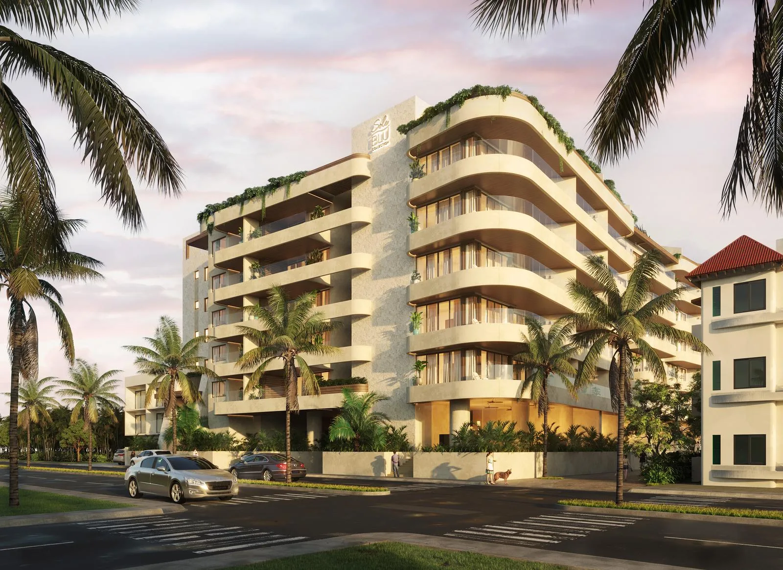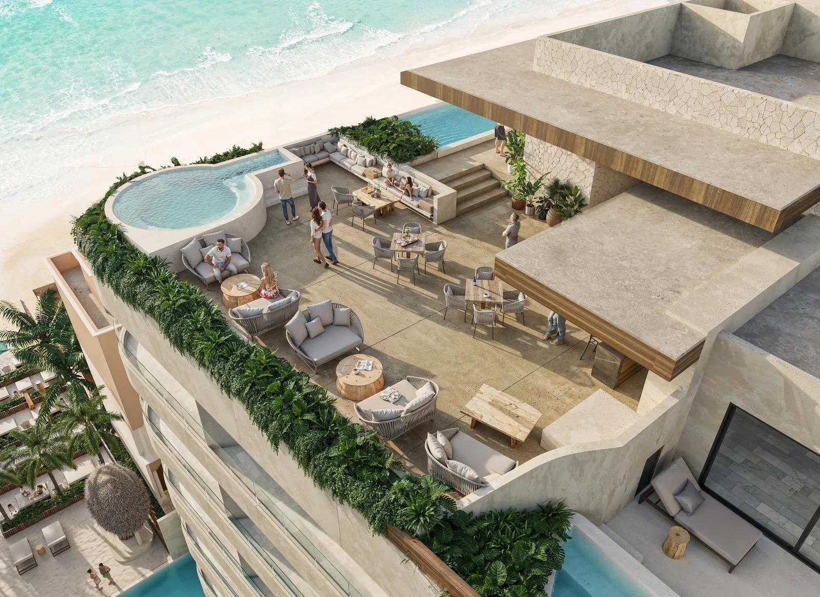 Building amenities include direct beach access, a roof pool with sea views, a pool bar, sun decks, a BBQ area, a gym, coworking spaces, a meeting room, parking, CCTV security, pet-friendly services, and a lobby with concierge.