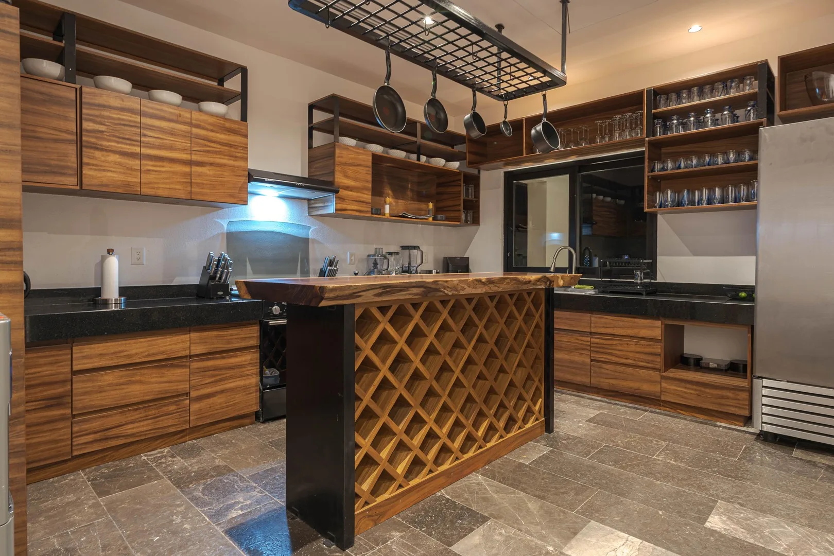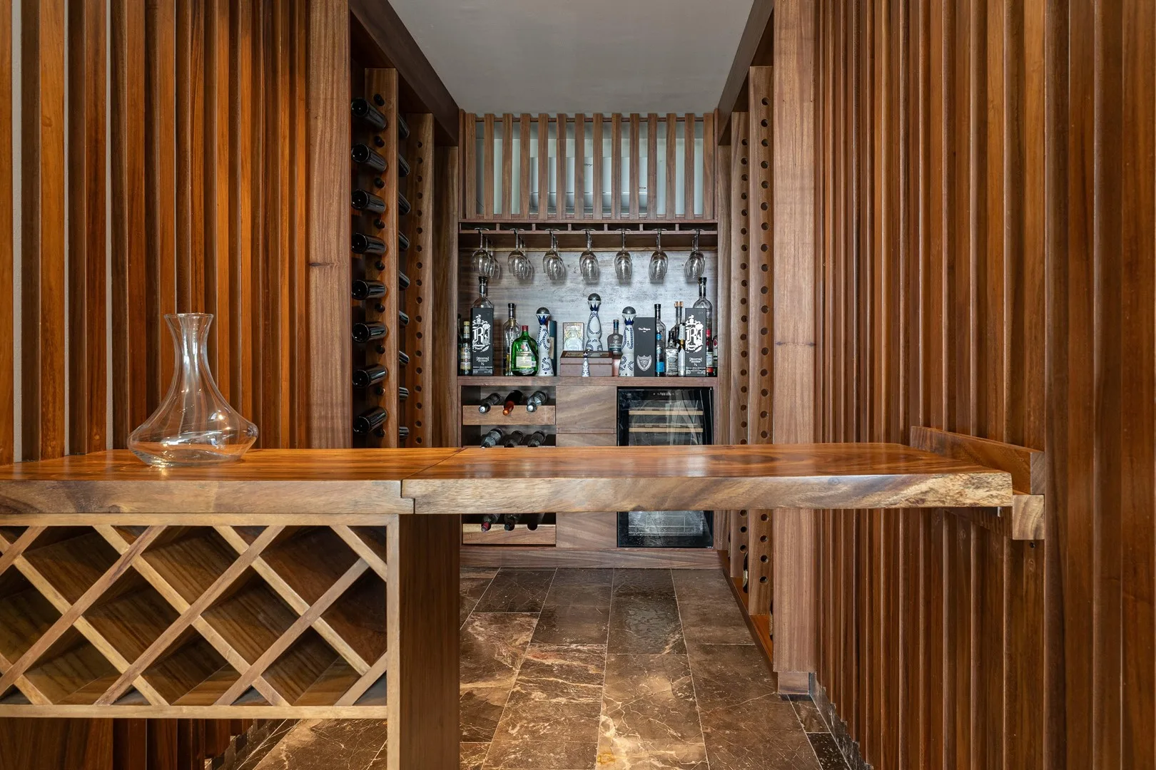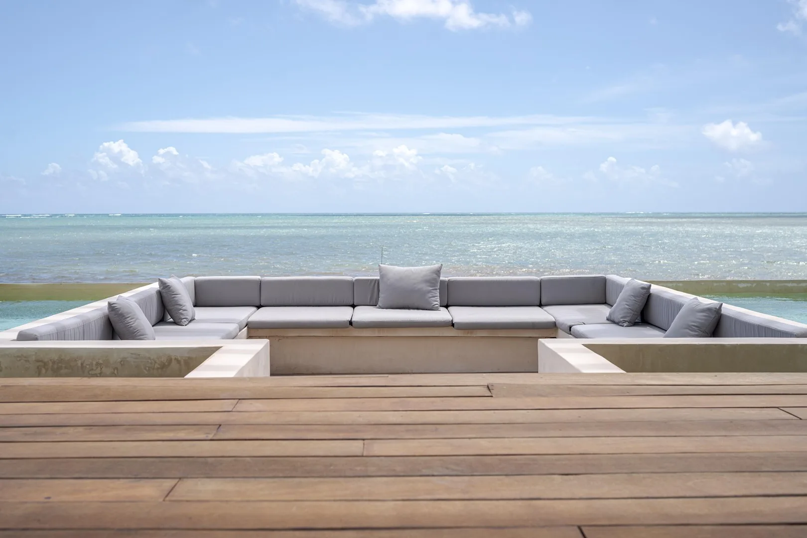 An infinity pool and sun deck provide views of the horizon, and a private cocktail bar is available for entertainment.