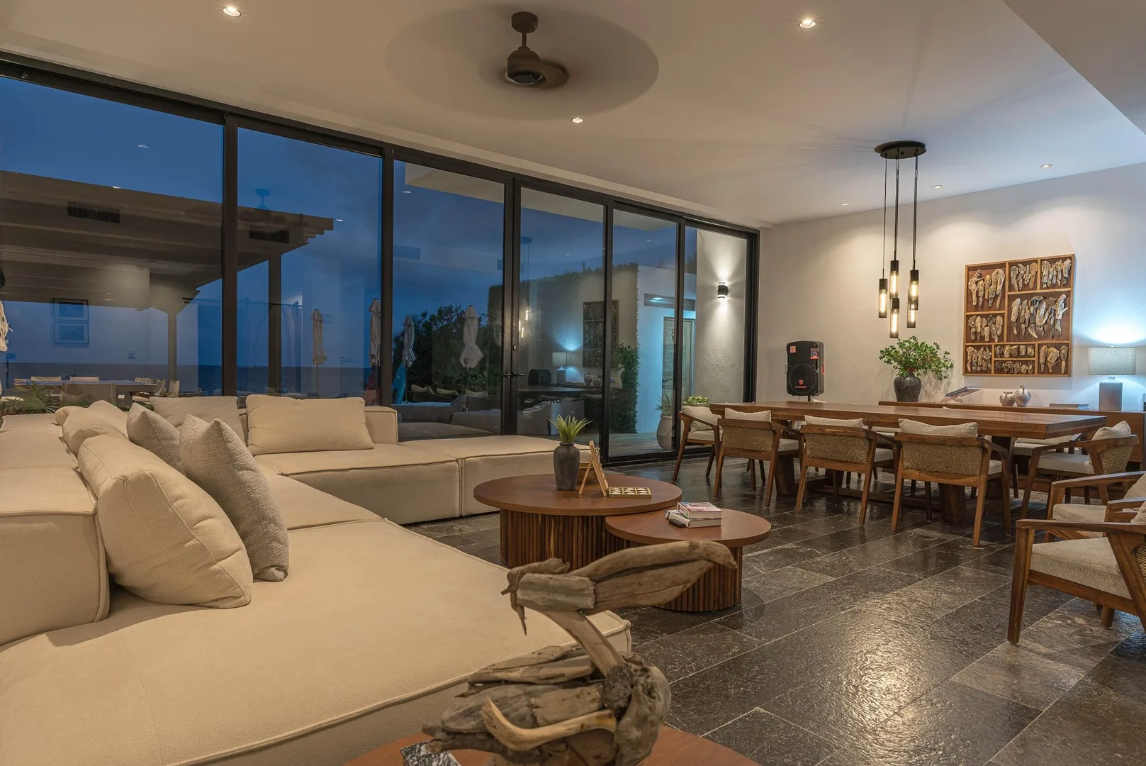 The estate features over 1, 100 square meters of living space on a private 820 square meter beachfront lot. Walls of glass blur the line between indoors and outdoors, inviting the ocean breeze into expansive living areas.