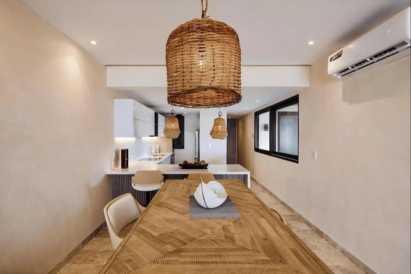 The property has 141. 40 square meters of integrated interior and exterior space. It features an open floor plan that connects the living room, dining room, and kitchen with a private terrace, ideal for enjoying the sea breeze and natural surroundings.