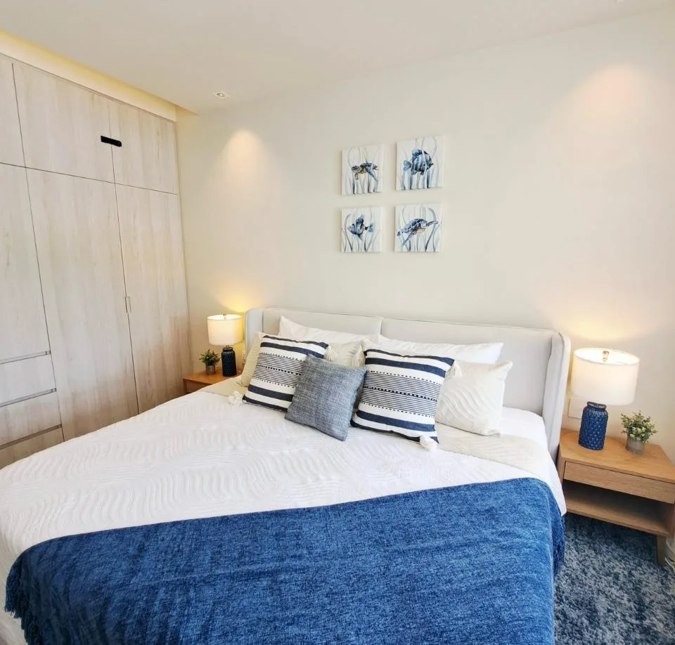 The primary bedroom features a king-size bed with a full en-suite bathroom. The second bedroom also features a king-size bed. The condo is fully furnished and tastefully decorated. It includes a modern, fully equipped kitchen and an in-unit washer and dryer.