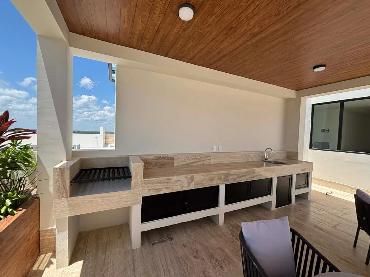 The property offers resort-style amenities. There is direct access to a spectacular white-sand beach and a swimming pool facing the sea. A rooftop area features a pool and lounge spaces. Other amenities include a barbecue and entertainment area, a fully equipped gym, a multi-purpose room, and an elevator.