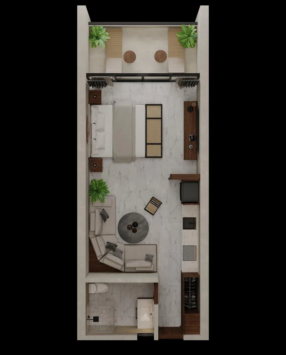 This one-bedroom, one-bathroom apartment is designed for comfortable and functional living. It combines high-quality finishes with a modern design that maximizes natural light and a sense of space, all within the tranquil and natural beauty of Puerto Morelos, Quintana Roo.
