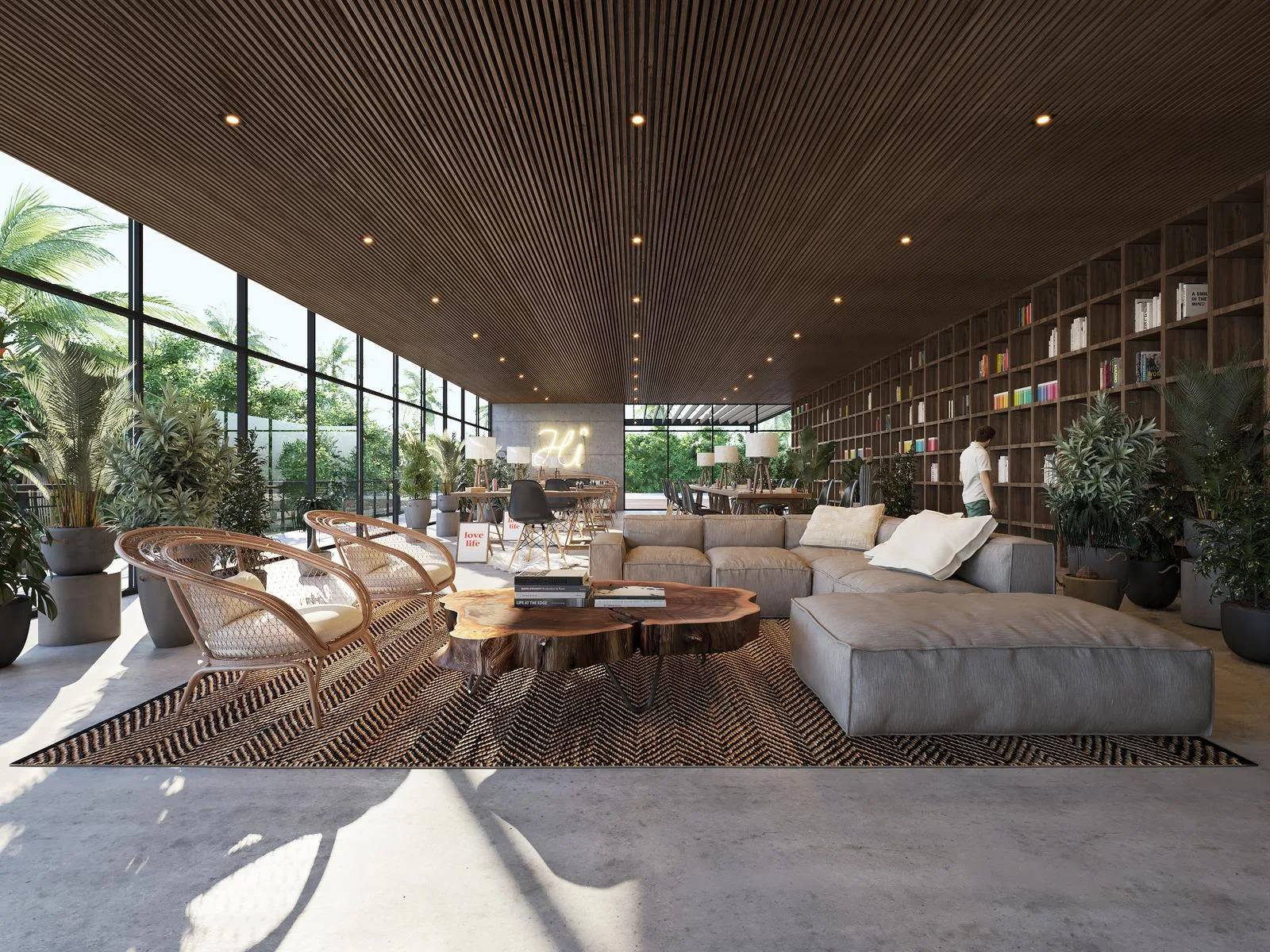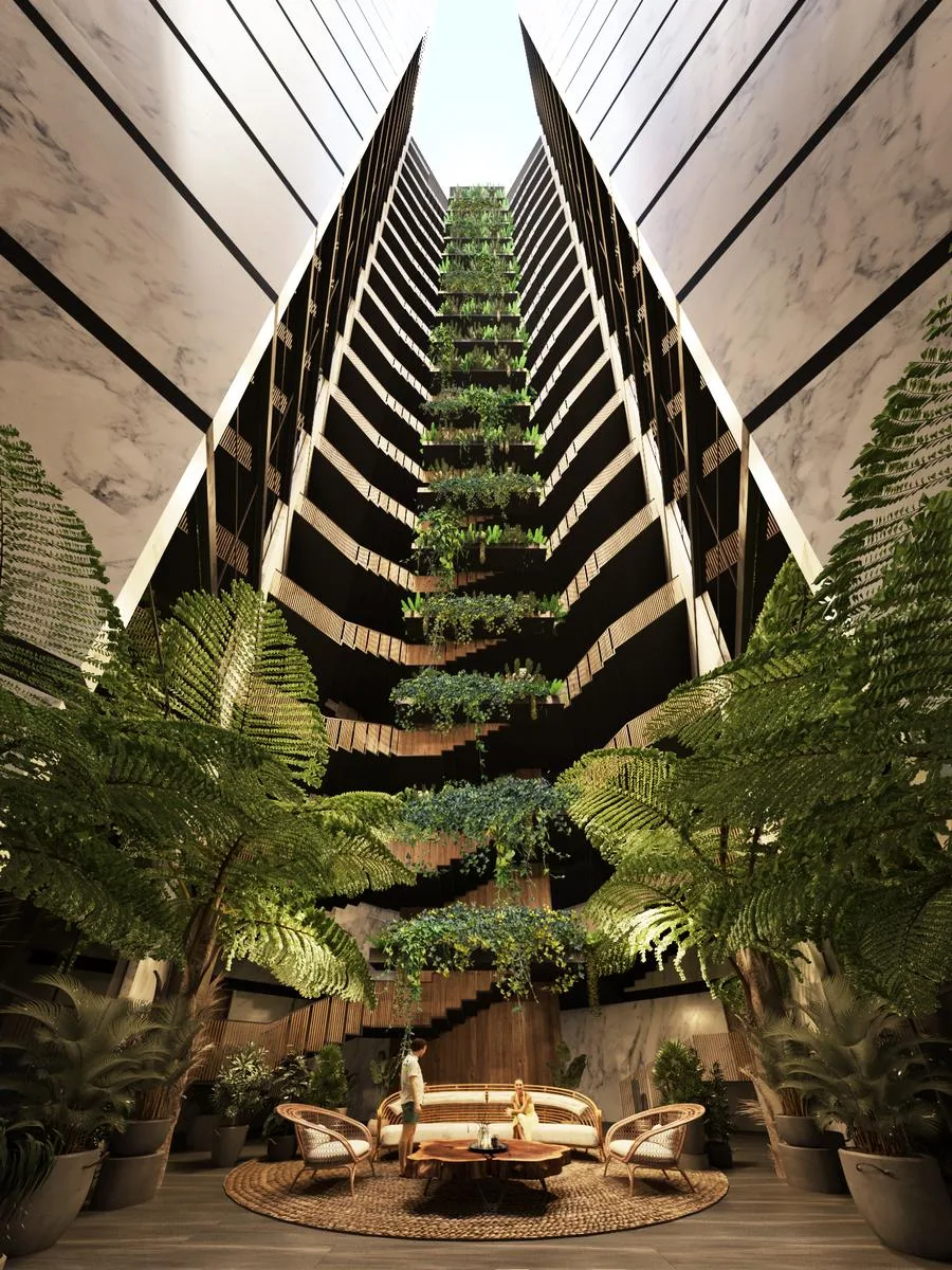 A creative coworking space is available for flexible work, along with covered parking. Lobby and garden lounges offer additional relaxation areas.