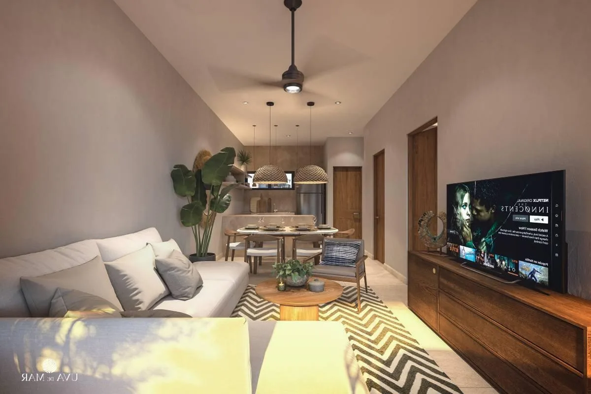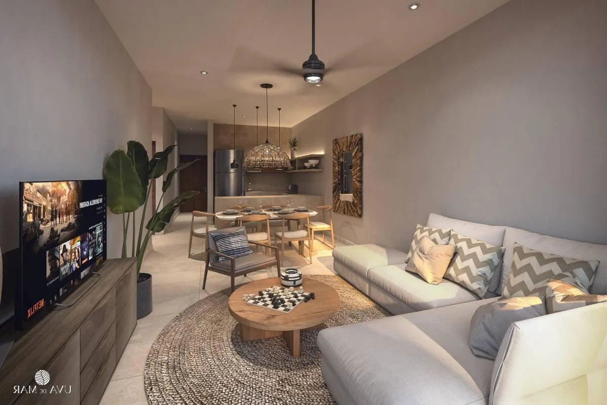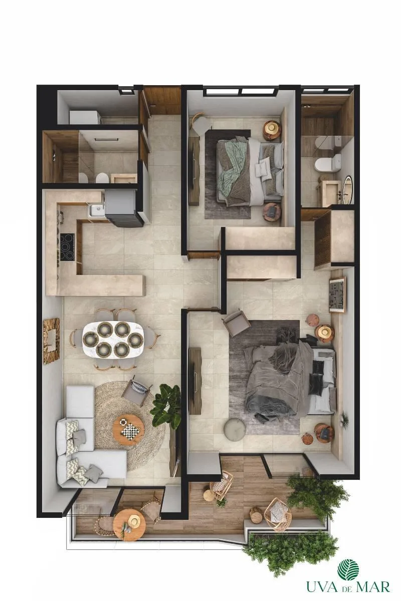 Two condominium models are available: Uva de Playa and Uva de la Costa. Both units feature 2 bedrooms, a private terrace, a dining room, a kitchenette with a breakfast bar, and 2 bathrooms. The Uva de Playa model measures 108. 05 square meters, while the Uva de la Costa model covers 102. 46 square meters.