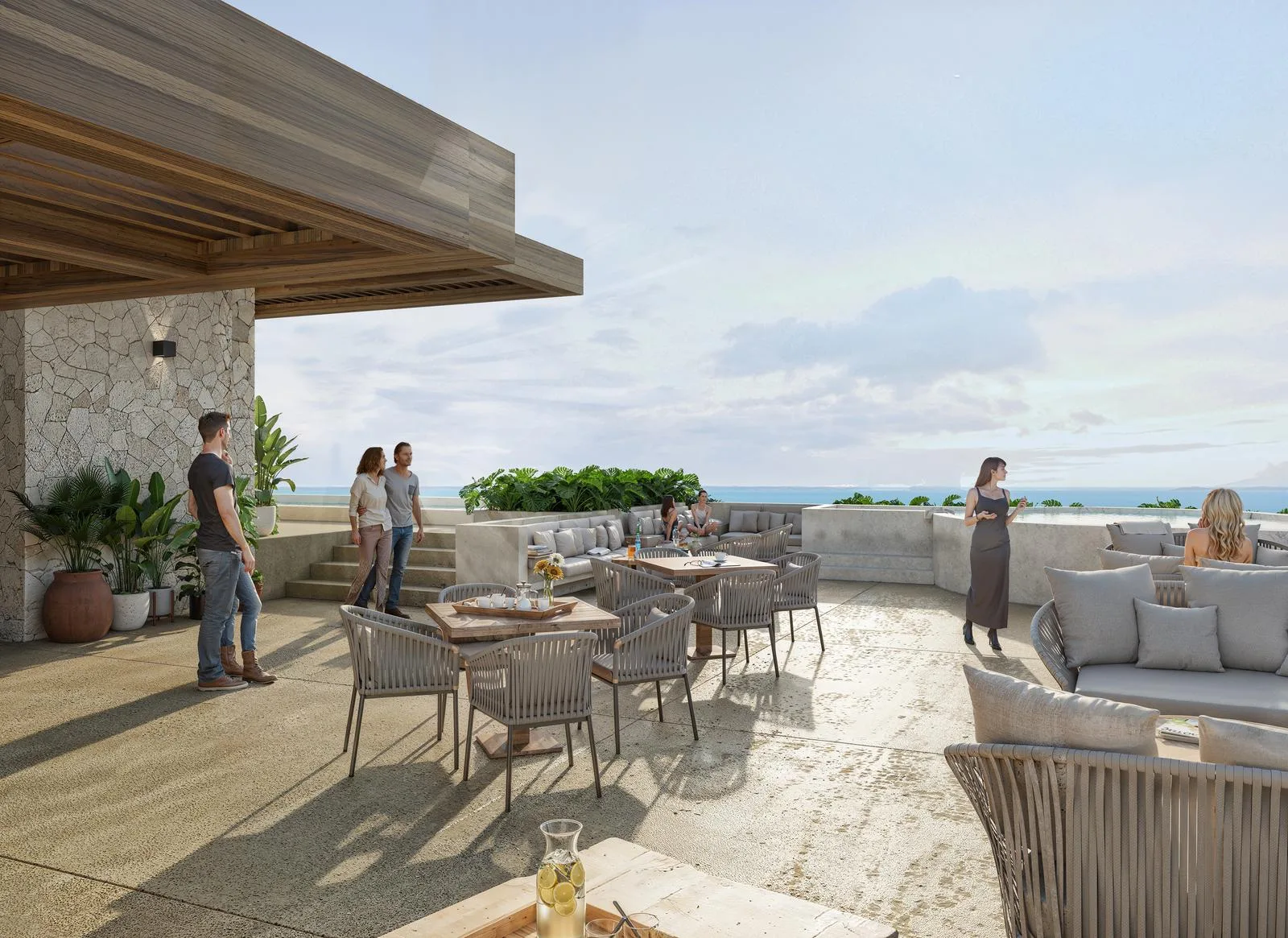 A private rooftop adds a unique feature, providing an exclusive space with a kitchenette, social area, Jacuzzi, sun decks, and spectacular views of the Caribbean Sea.