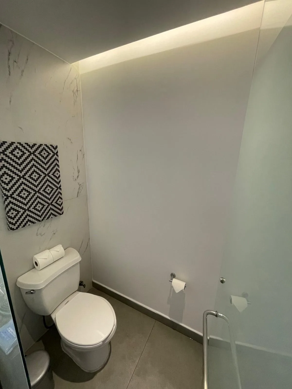 The apartment features one bedroom and one bathroom within an open-concept layout that integrates the living and dining areas. The kitchen is fully equipped, and the finishes are modern. The primary bedroom includes a king-size bed and an ensuite bathroom.