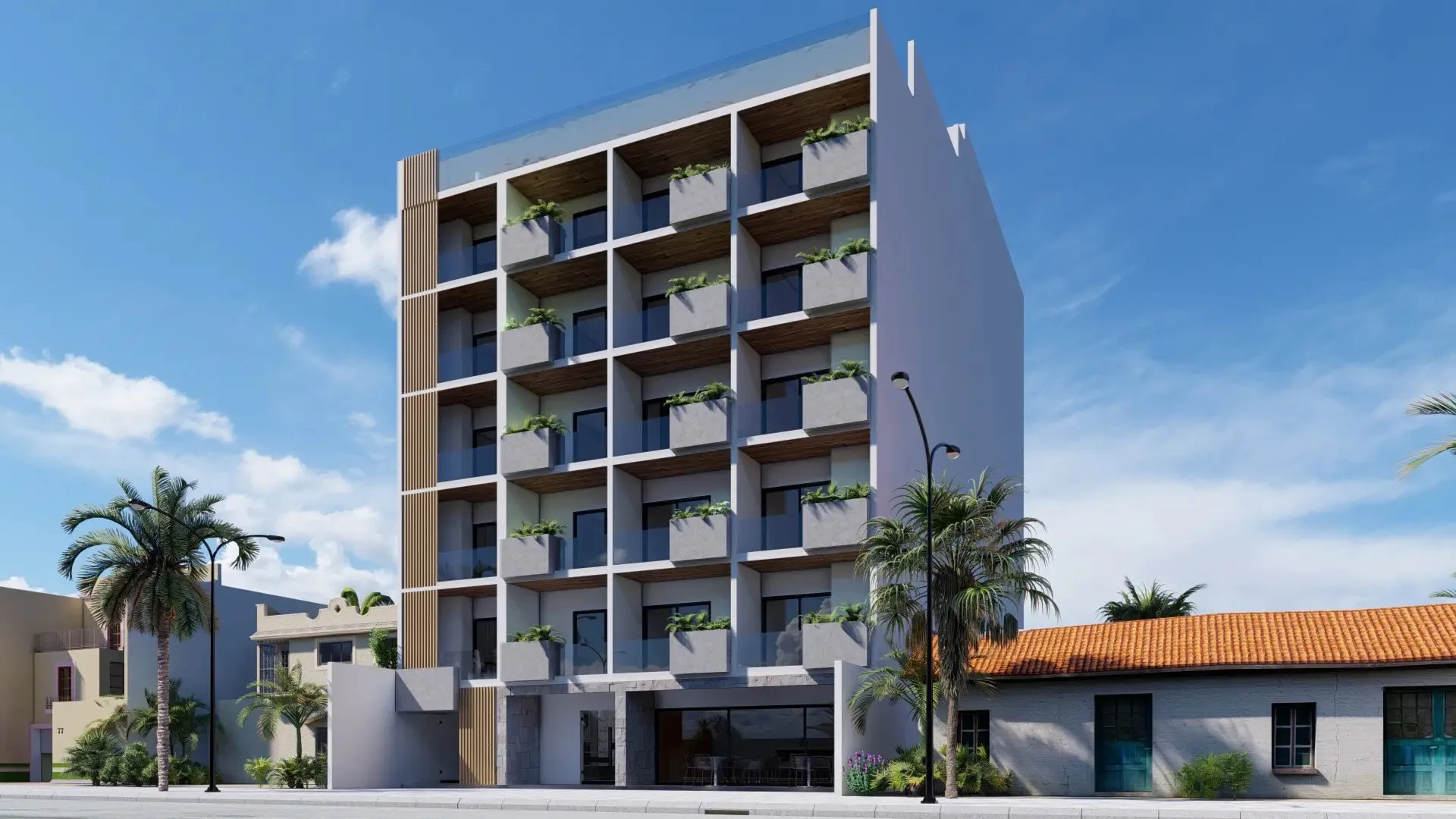Unit finishes include rectified national porcelain flooring and granite countertops. Carpentry is made of parota wood. The property features 10mm tempered glass railings and European-style windows, both rated as hurricane-resistant. Additional features are LED lighting, inverter air conditioning, an induction cooktop, an electronic lock, and a tempered glass shower door.
