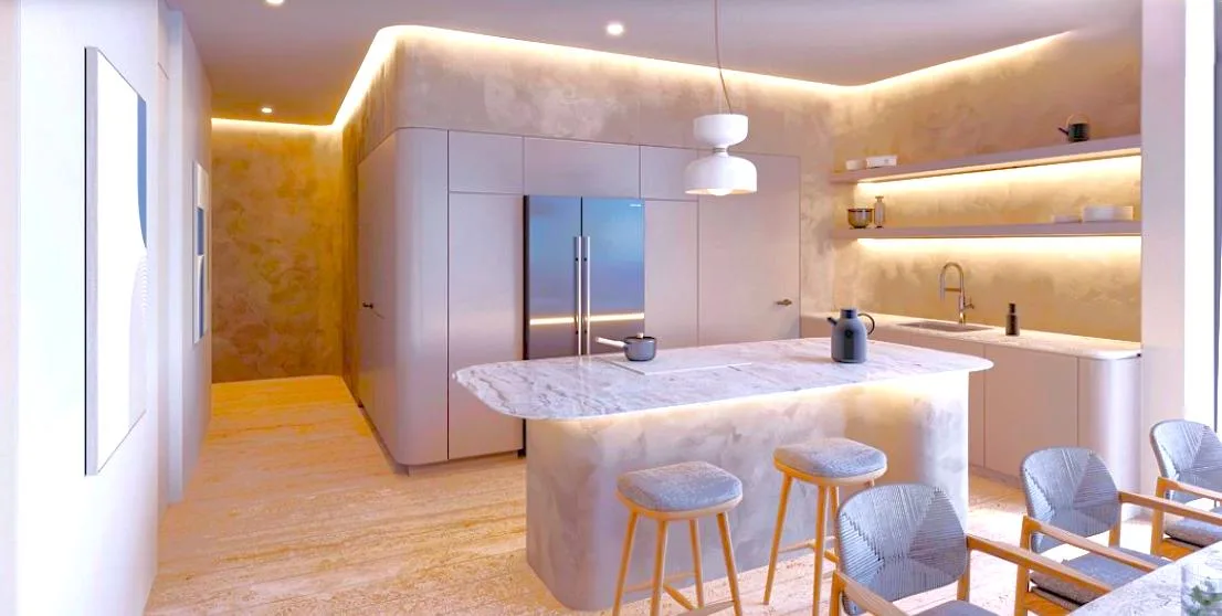 A comprehensive suite of amenities is offered, including a 24/7 security service and reception with a lobby. Recreational facilities feature a beach sports cabana, a padel court, a gym, a swimming lane, kayaks, paddle boards, an infinite-edge beach pool with poolside cabanas, a fire pit, a sky bar, and a jacuzzi. For work and convenience, there is a coworking space, meeting rooms, valet parking, and room service. Additional amenities include e-karts, electric bicycles, and a sky terrace.