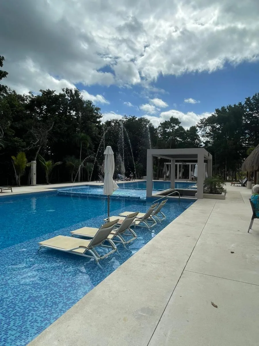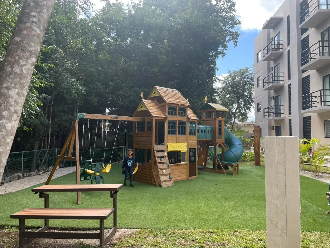 The condominium is new, spacious, and surrounded by vegetation. It is close to the town of Puerto Morelos and is a fully residential complex with 24/7 security. Amenities include a swimming pool, children's play area, extensive gardens, a barbecue area, a pet-friendly zone, a paddle court, a basketball court, and a yoga sector.
