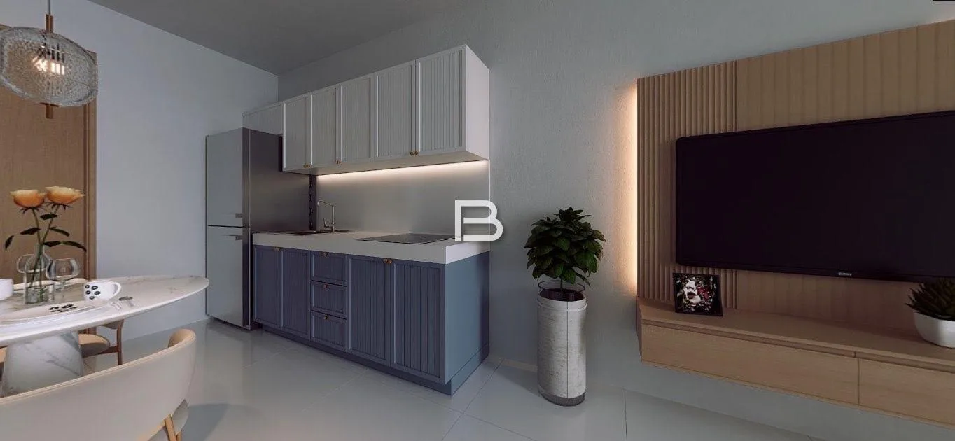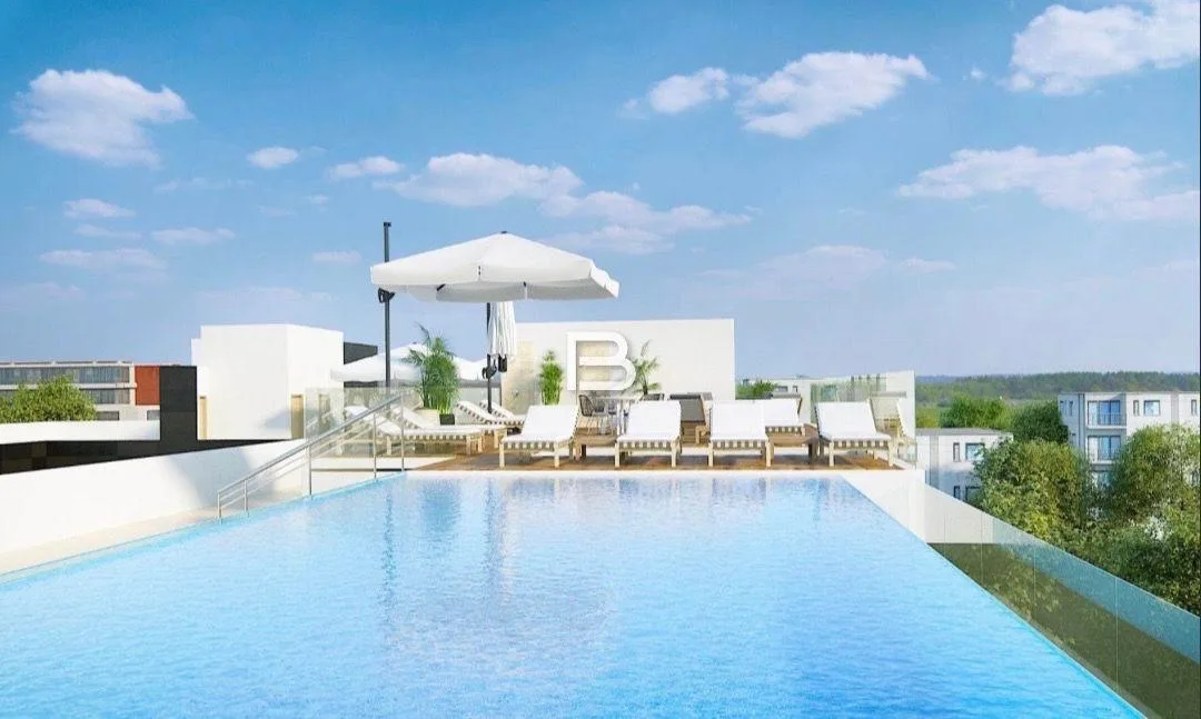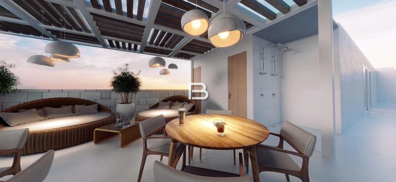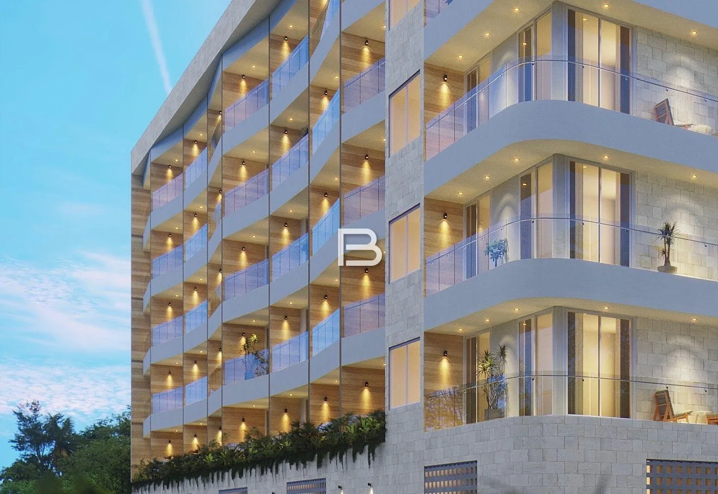 Residents have access to a rooftop sun deck with sea views, a jacuzzi, a swimming pool, a gym, a kids' club, a co-working space, 24/7 security, and a lobby.