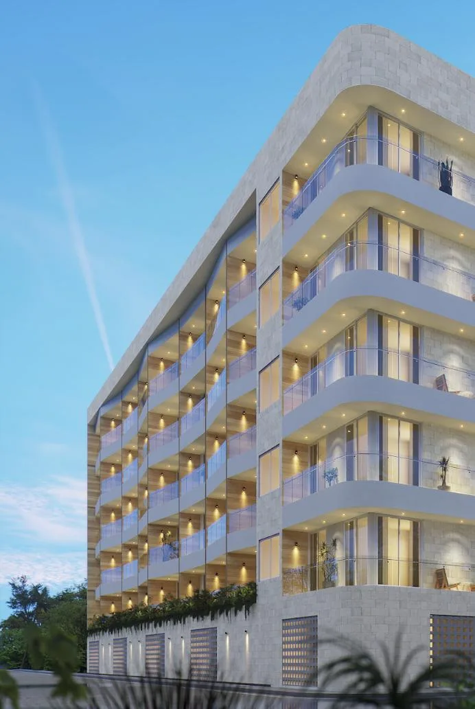 The building offers a range of amenities, including a rooftop pool with a sea view, a jacuzzi, and a solarium. Residents have access to an equipped gym, a coworking space, a Kids Club, and a lobby with 24-hour security reception. Elevators and parking are available, and the building incorporates smart management systems.