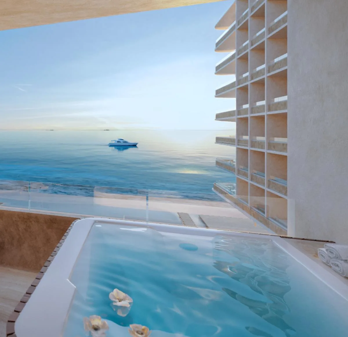 The development offers units from studios to two-bedroom apartments. This specific model is a loft with a construction area of 68. 28 square meters. Units feature terraces, balconies, or swim-up access depending on the model.