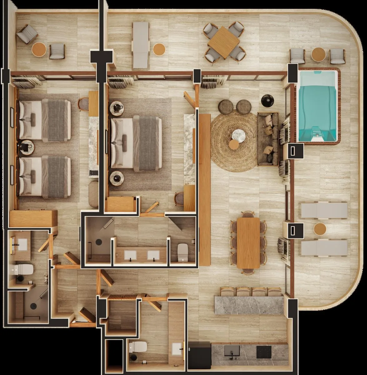 The general layout comprises a living room, dining room, integrated kitchen, two bedrooms, and two and a half bathrooms. The residence includes three terraces, a plunge pool, a lock-off system, and storage.